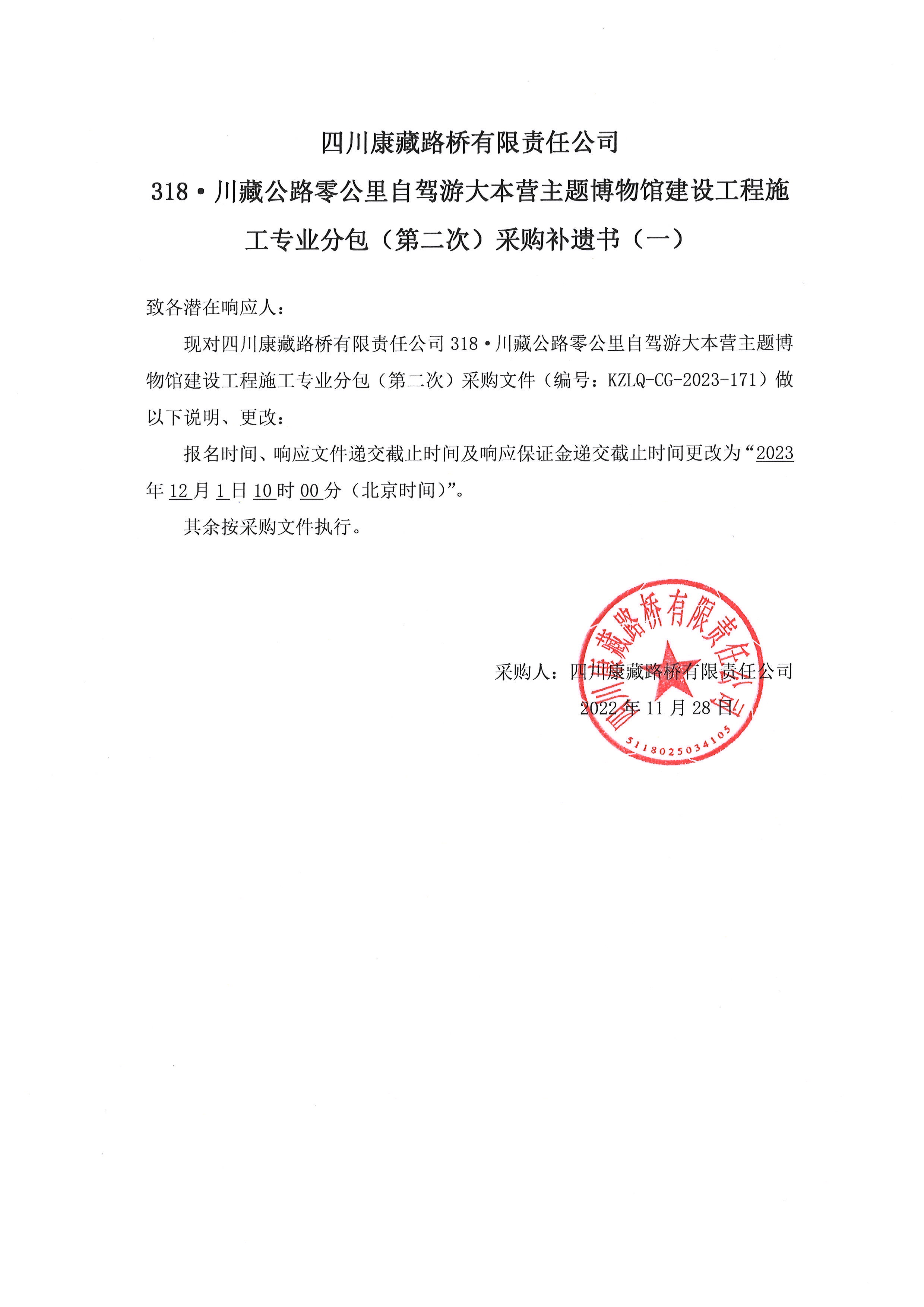 四川康藏路橋有限責(zé)任公司318·川藏公路零公里自駕游大本營主題博物館建設(shè)工程施工專業(yè)分包(第二次)采購補遺書(一)