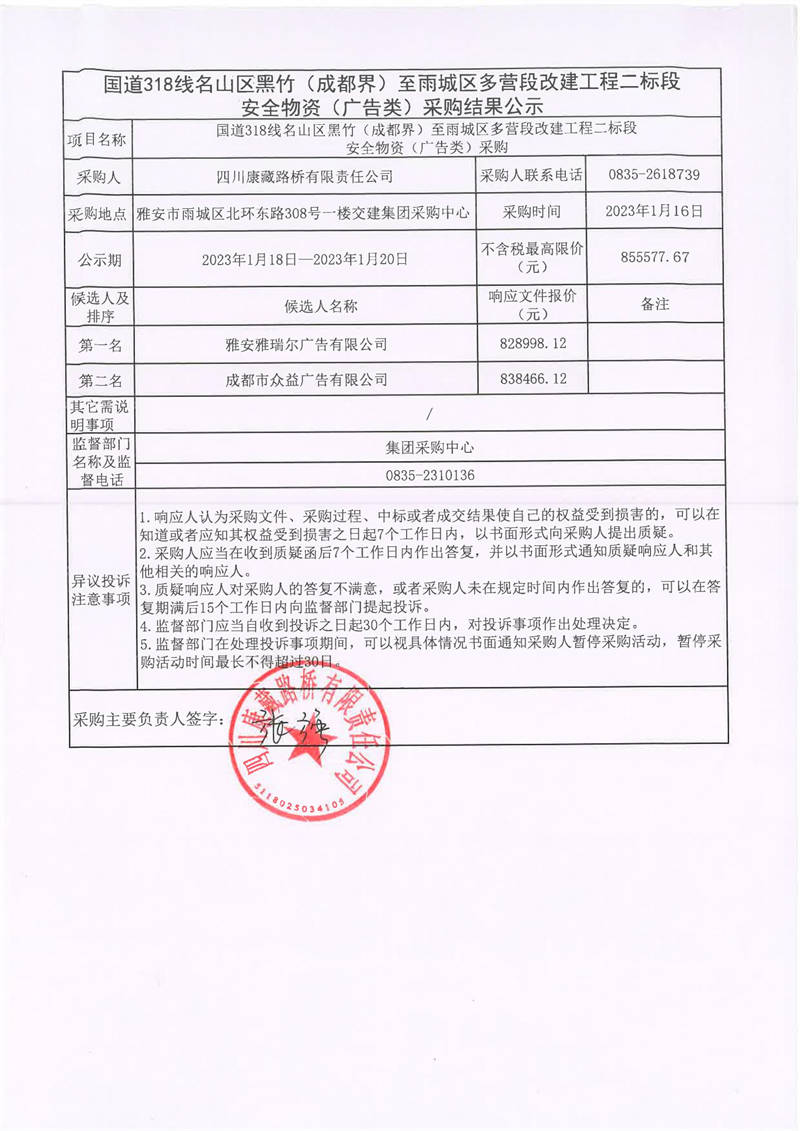 四川康藏路橋有限責(zé)任公司國道318線名山區(qū)黑竹(成都界)至雨城區(qū)多營段改建工程二標(biāo)段安全物資(廣告類)采購結(jié)果公示