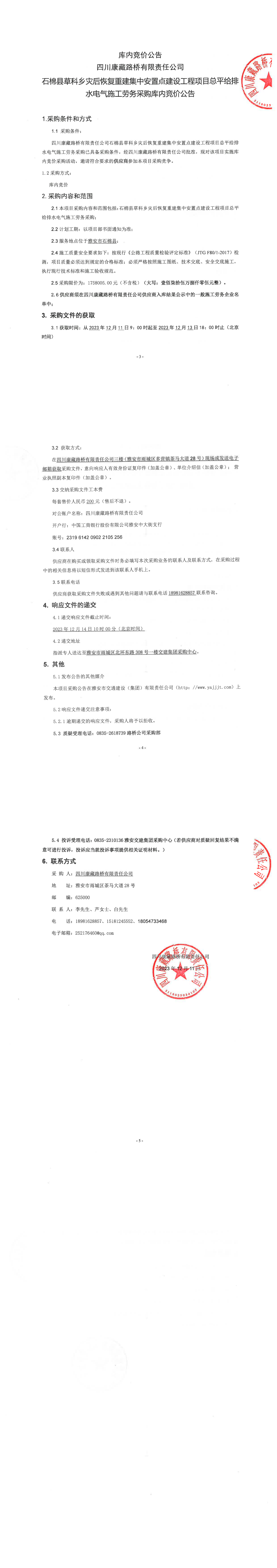 四川康藏路橋有限責(zé)任公司石棉縣草科鄉(xiāng)災(zāi)后恢復(fù)重建集中安置點(diǎn)建設(shè)工程項(xiàng)目總平給排水電氣施工勞務(wù)采購庫內(nèi)競價(jià)公告