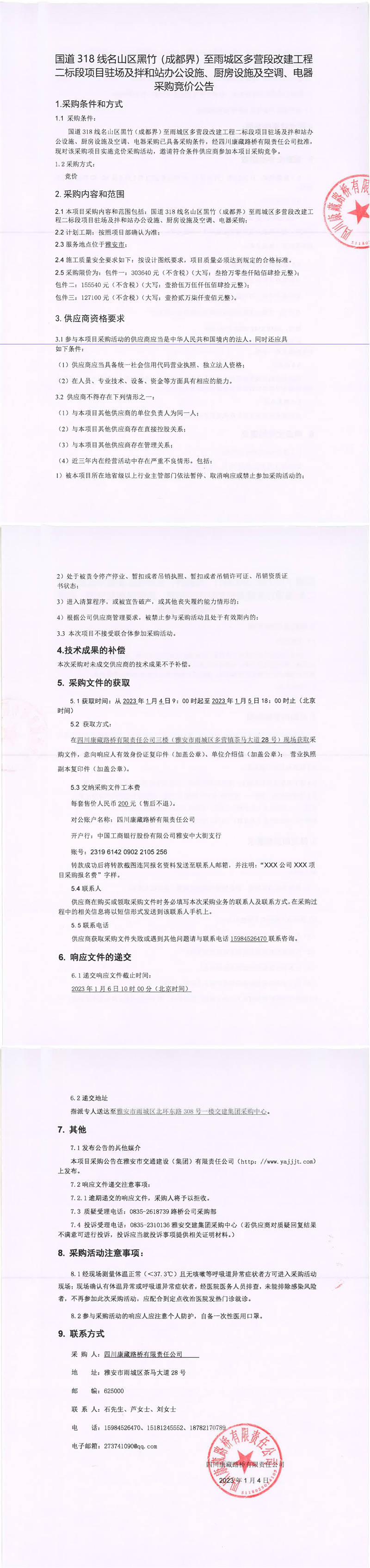 四川康藏路橋有限責任公司國道318線名山區(qū)黑竹(成都界)至雨城區(qū)多營段改建工程二標段項目駐場及拌和站辦公設施、廚房設施及空調(diào)、電器采購競價公告