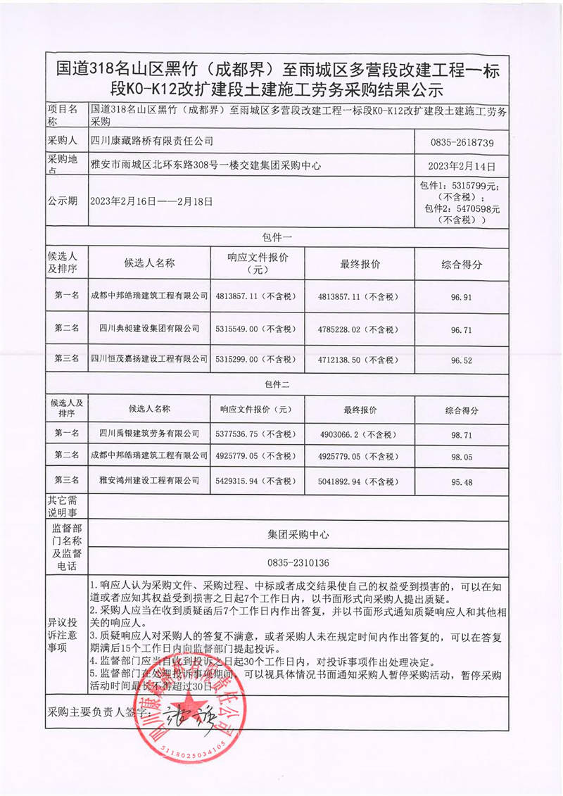 四川康藏路橋有限責(zé)任公司國道318名山區(qū)黑竹(成都界)至雨城區(qū)多營段改建工程一標段K0-K12改擴建段土建施工勞務(wù)采購結(jié)果公示