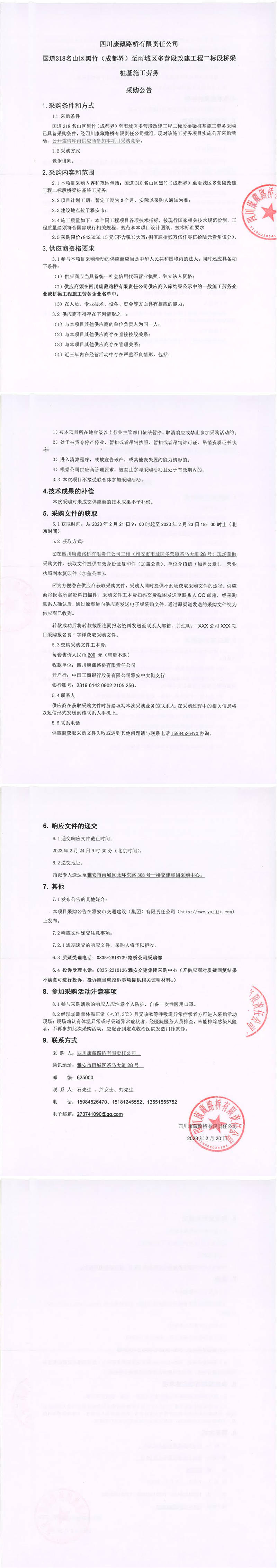 四川康藏路橋有限責(zé)任公司國(guó)道318名山區(qū)黑竹(成都界)至雨城區(qū)多營(yíng)段改建工程二標(biāo)段橋梁樁基施工勞務(wù)