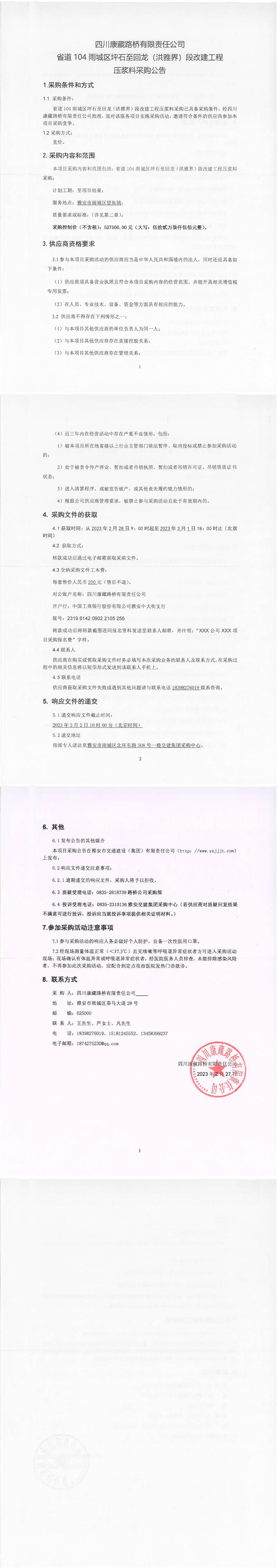 四川康藏路橋有限責任公司省道104雨城區(qū)坪石至回龍(洪雅界)段改建工程壓漿料采購公告