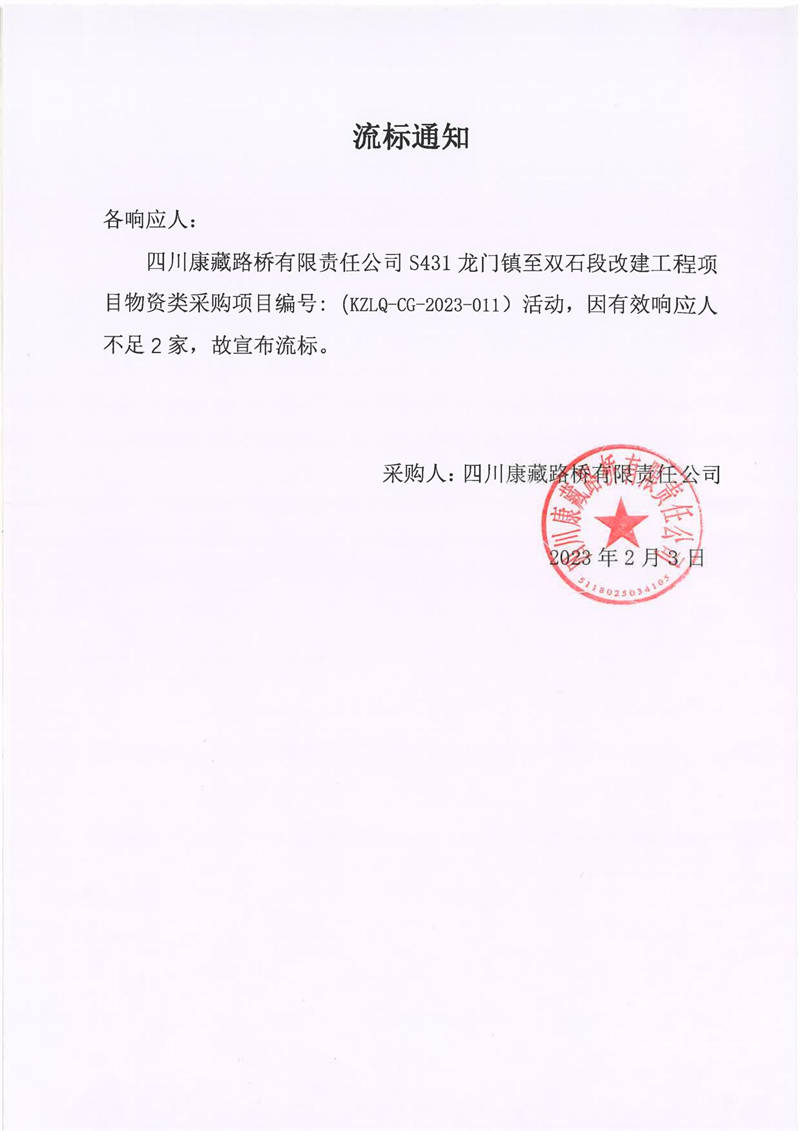四川康藏路橋有限責(zé)任公司S431龍門鎮(zhèn)至雙石段改建工程項(xiàng)目物資類采購流標(biāo)通知