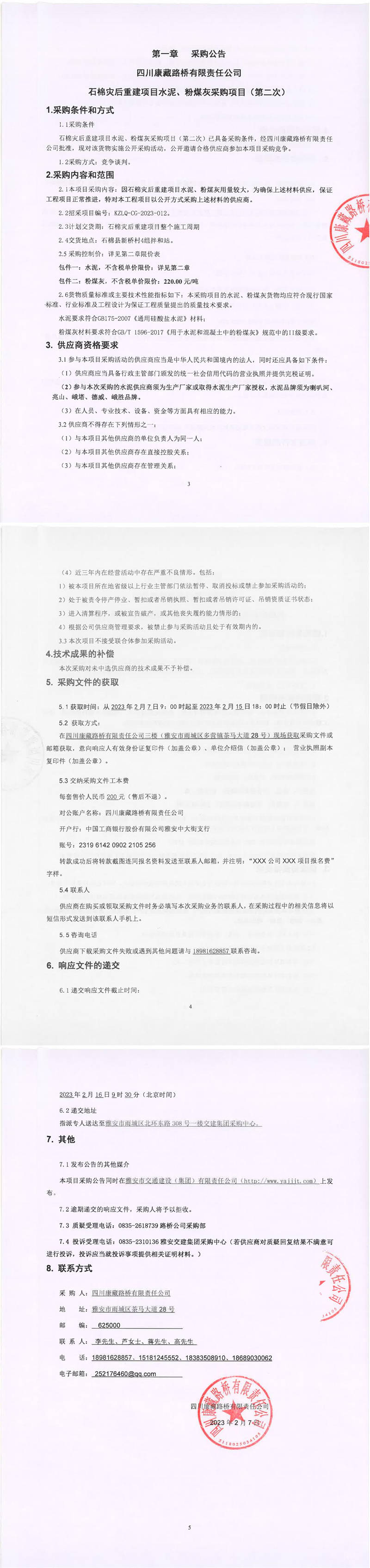 四川康藏路橋有限責(zé)任公司石棉災(zāi)重建項目水泥、粉煤灰采購項目(第二次)采購公告