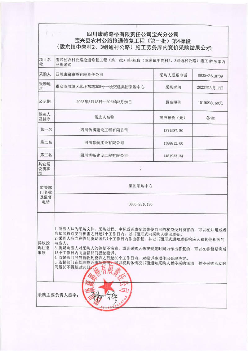 四川康藏路橋有限責(zé)任公司寶興分公司寶興縣農(nóng)村公路搶通修復(fù)工程(第一批)第4標(biāo)段(隴東鎮(zhèn)中崗村2、3組通村公路)施工勞務(wù)庫內(nèi)競價采購結(jié)果公示