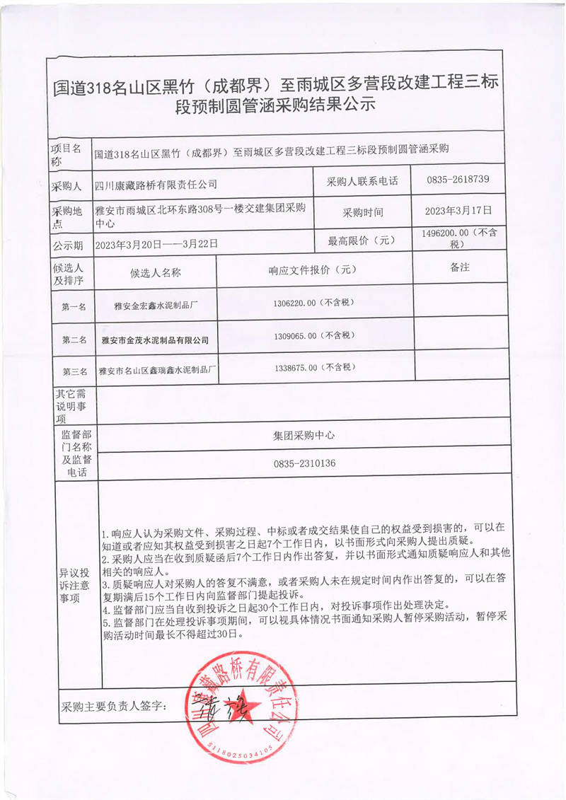 四川康藏路橋有限責(zé)任公司國(guó)道318名山區(qū)黑竹(成都界)至雨城區(qū)多營(yíng)段改建工程三標(biāo)段預(yù)制圓管涵采購(gòu)結(jié)果公示