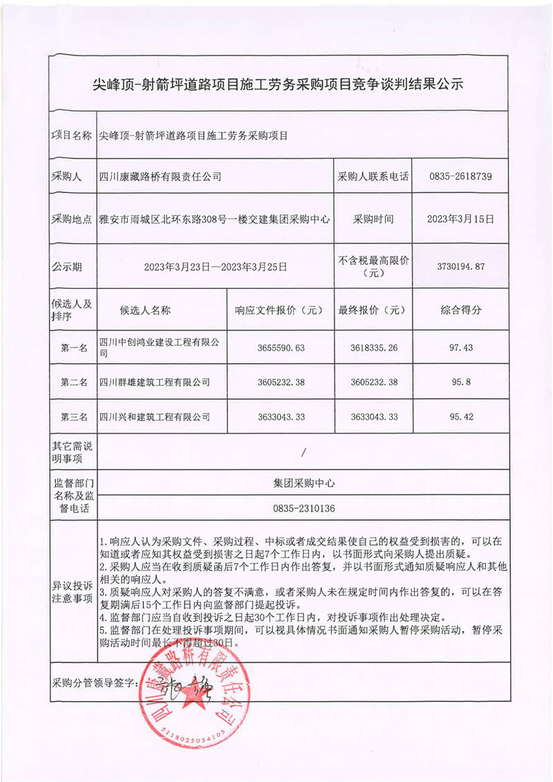 四川康藏路橋有限責任公司尖峰頂-射箭坪道路項目施工勞務采購項目競爭談判結果公示