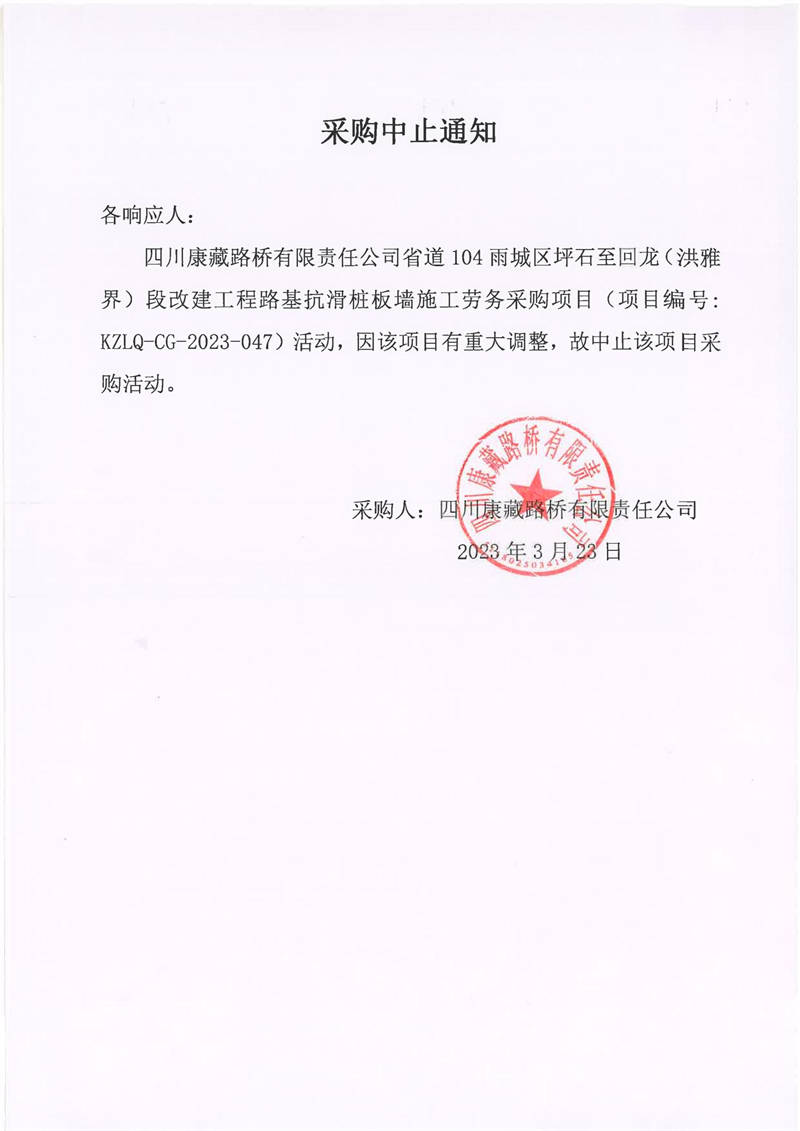 四川康藏路橋有限責(zé)任公司省道104雨城區(qū)坪石至回龍(洪雅界)段改建工程路基抗滑樁版墻施工勞務(wù)采購終止通知