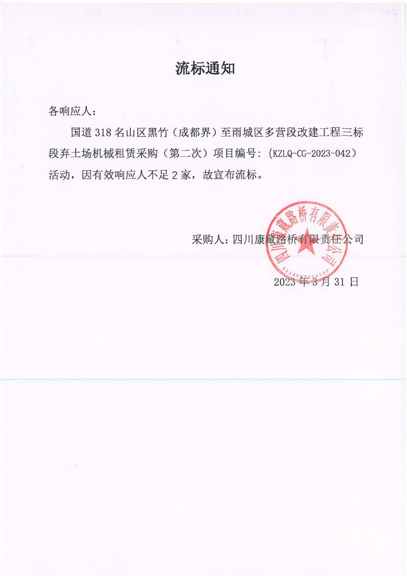 四川康藏路橋有限責(zé)任公司國道318名山區(qū)黑竹(成都界)至雨城區(qū)多營段改建工程三標(biāo)段棄土場機械租賃采購流標(biāo)通知