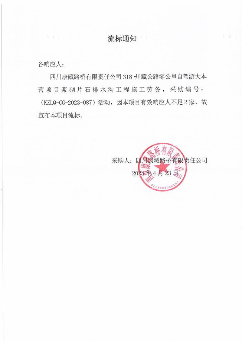 四川康藏路橋有限責(zé)任公司318·川藏公路零公里自駕游大本營項目漿砌片石排水溝工程施工勞務(wù)流標(biāo)通知