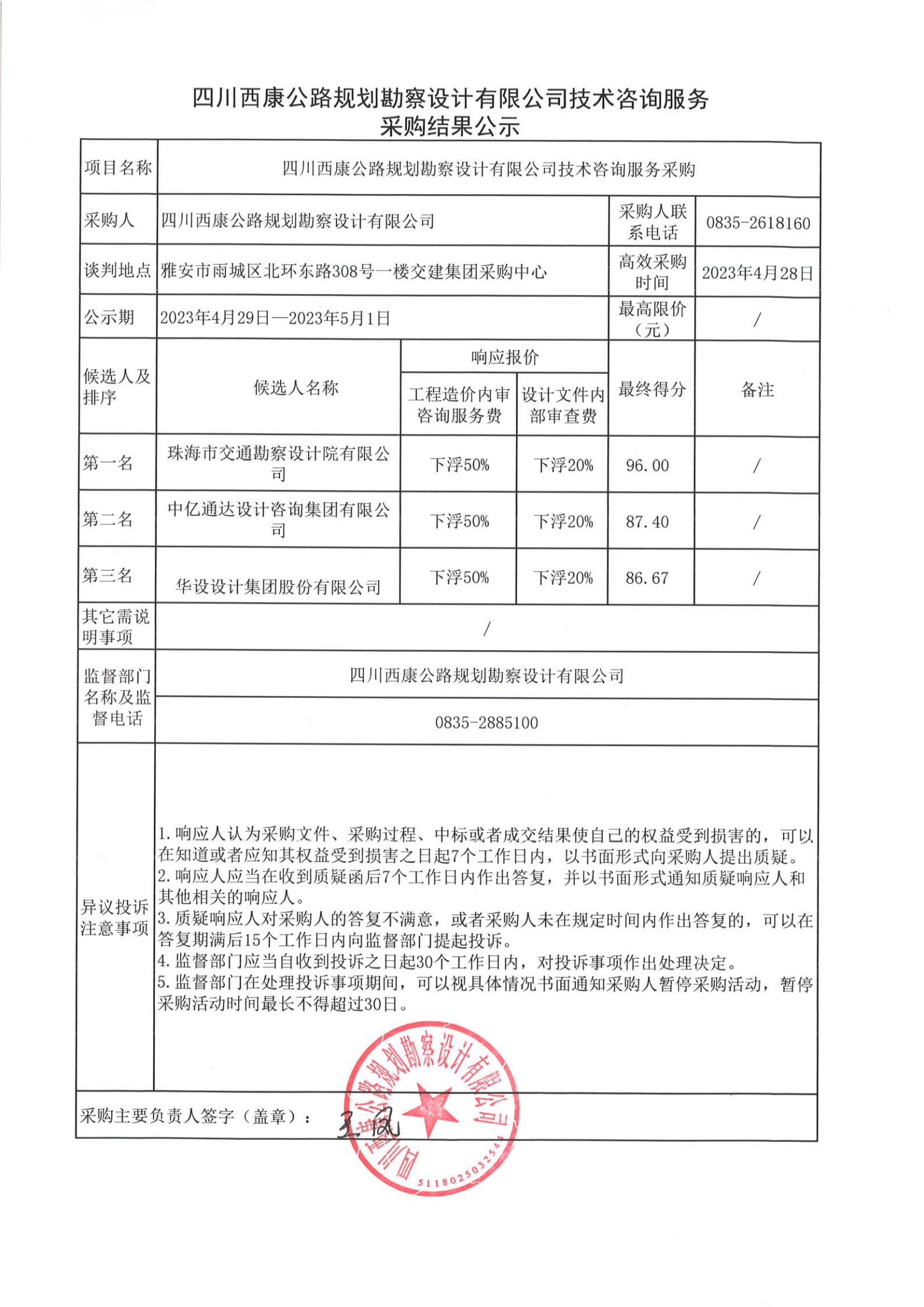 四川西康公路規(guī)劃勘察設(shè)計(jì)有限公司技術(shù)咨詢服務(wù)采購結(jié)果公示