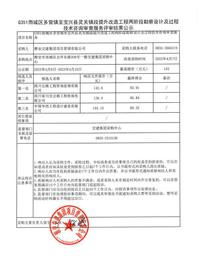 雅安交建集團(tuán)項(xiàng)目管理有限公司G351雨城區(qū)多營(yíng)鎮(zhèn)至寶興縣靈關(guān)鎮(zhèn)段提升改造工程兩階段勘察設(shè)計(jì)及過程技術(shù)咨詢審查服務(wù)評(píng)審結(jié)果公示