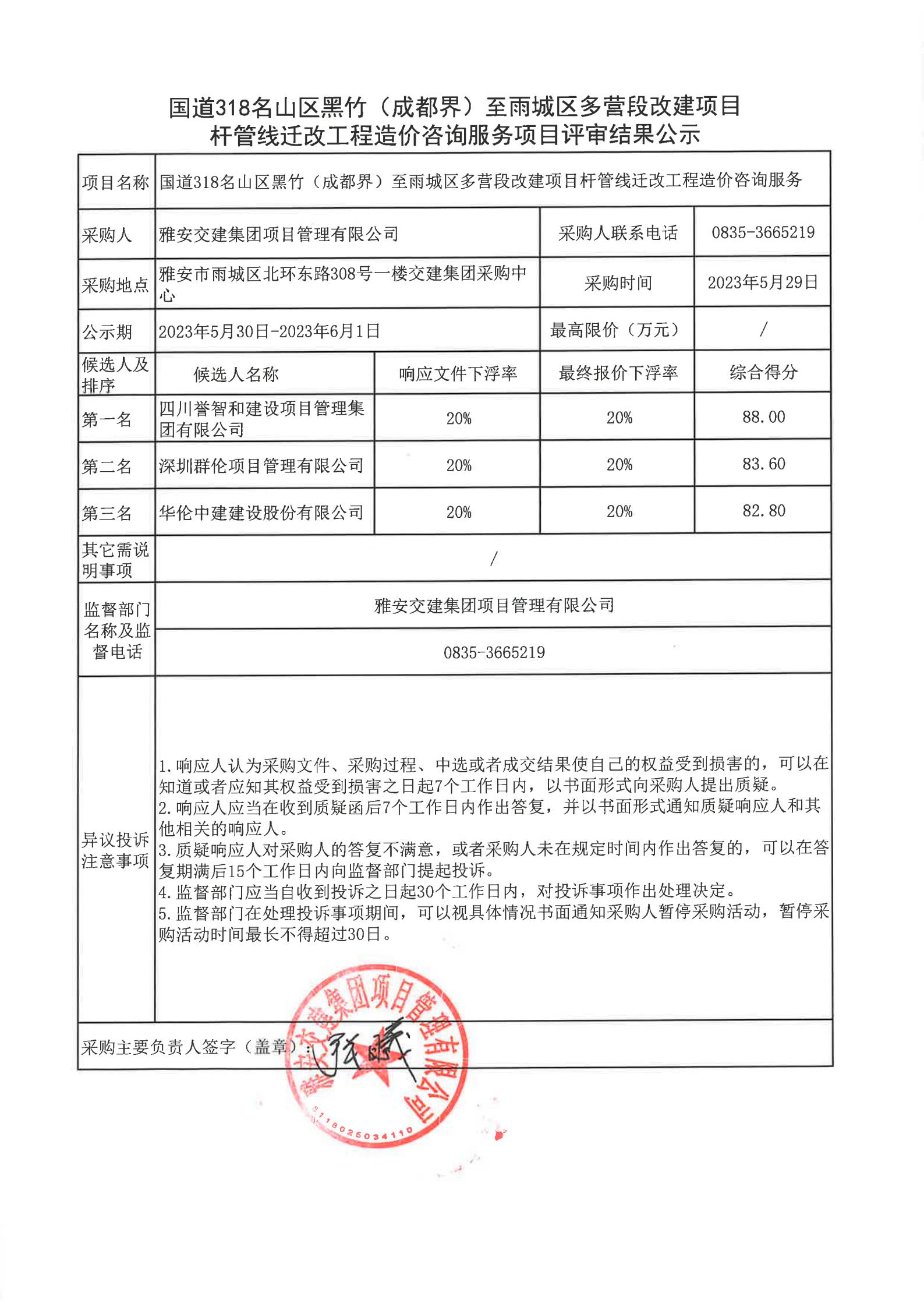 雅安交建集團項目管理有限公司國道318名山區(qū)黑竹(成都界)至雨城區(qū)多營段改建項目桿管線遷改工程造價咨詢服務項目評審結果公示