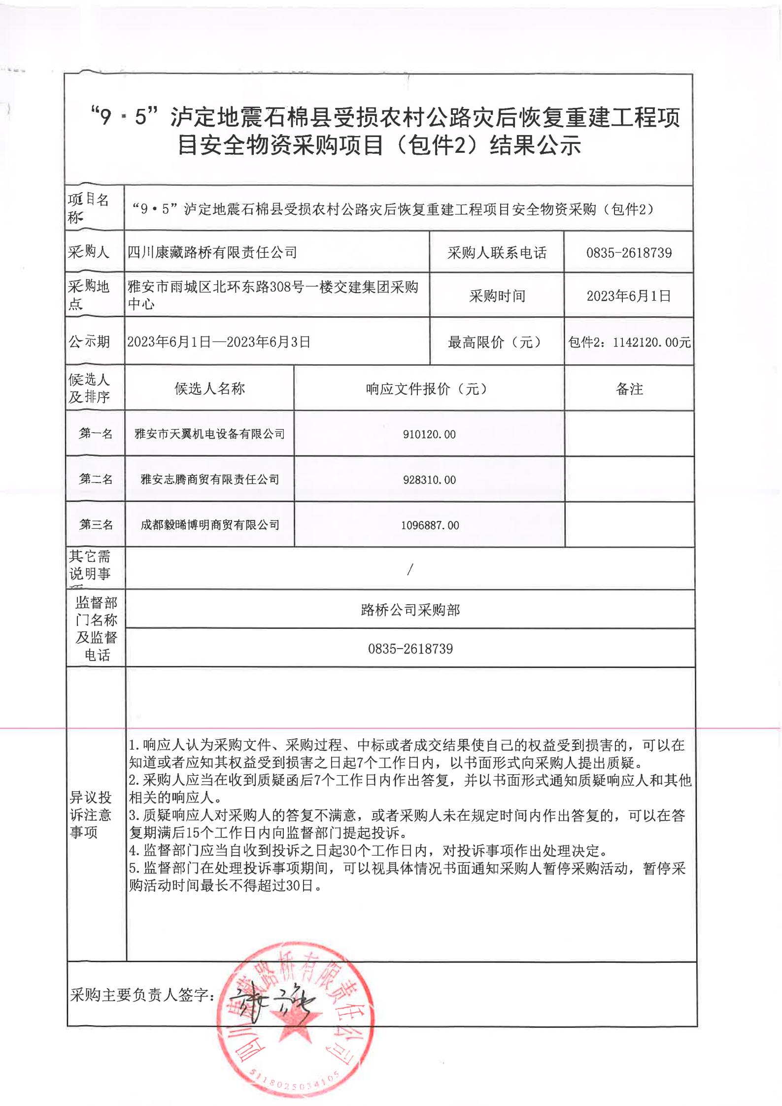四川康藏路橋有限責(zé)任公司“9·5”瀘定地震石棉縣受損農(nóng)村公路災(zāi)后恢復(fù)重建工程項目安全物資項目(包件2)結(jié)果公示