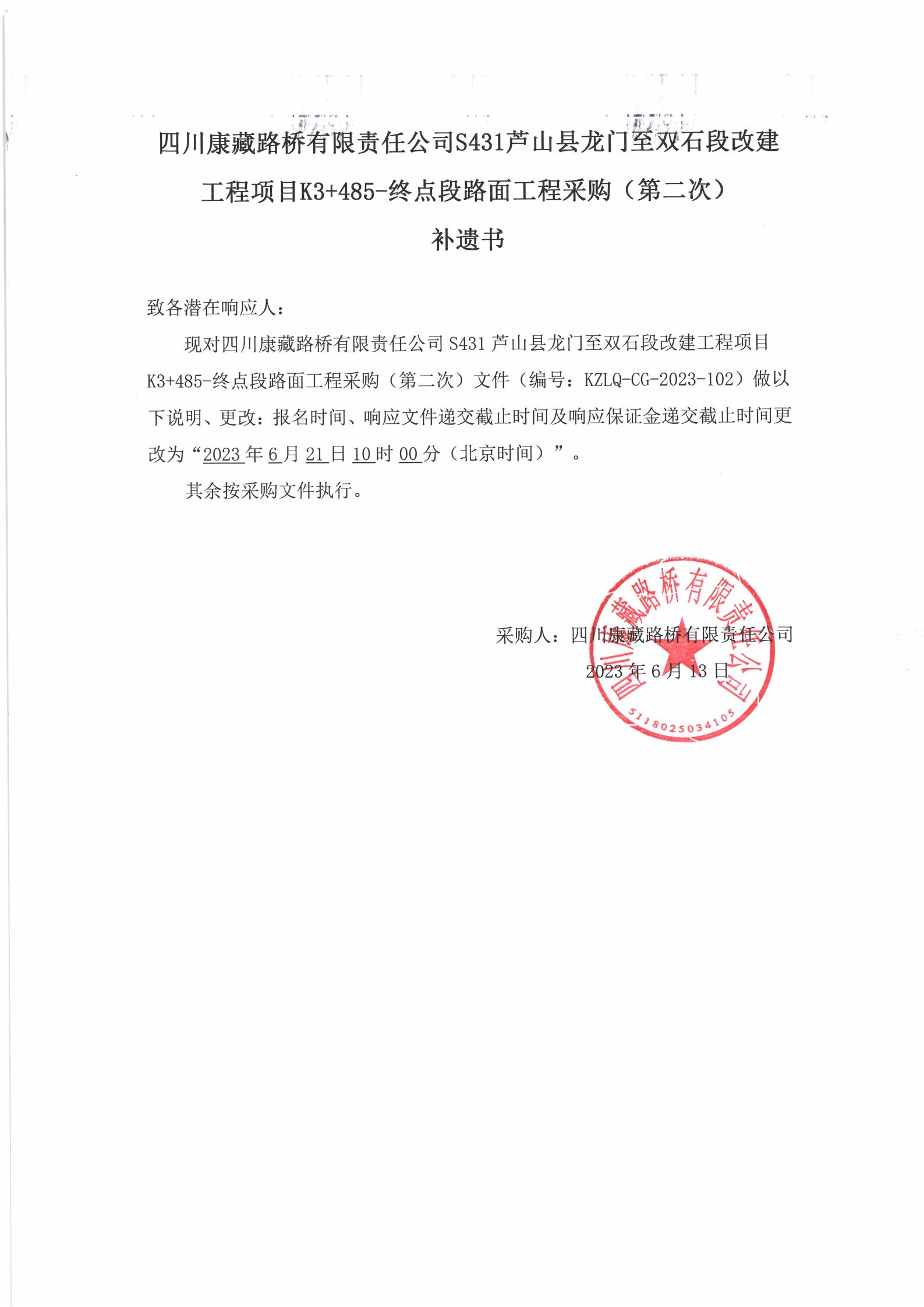 四川康藏路橋有限責(zé)任公司S431蘆山縣龍門至雙石段改建工程項(xiàng)目K3+485-終點(diǎn)段路面工程采購(gòu)(第二次)補(bǔ)遺書