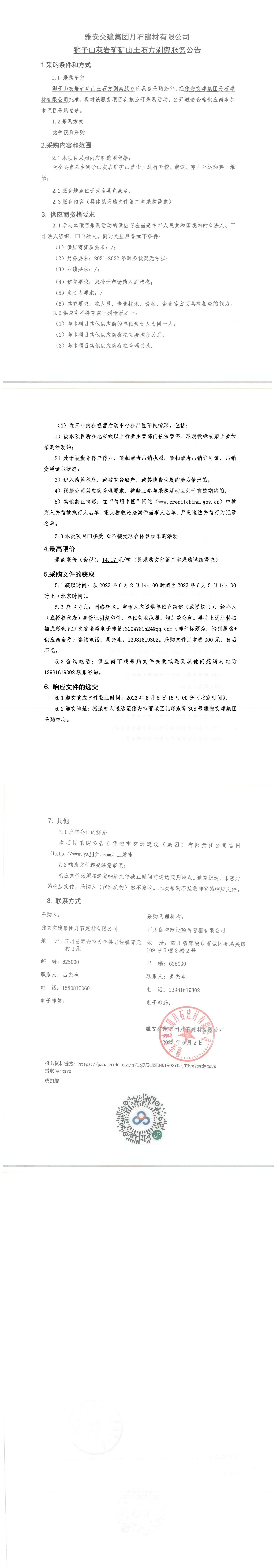 雅安交建集團丹石建材有限公司獅子山灰?guī)r礦礦山土石方剝離服務公告