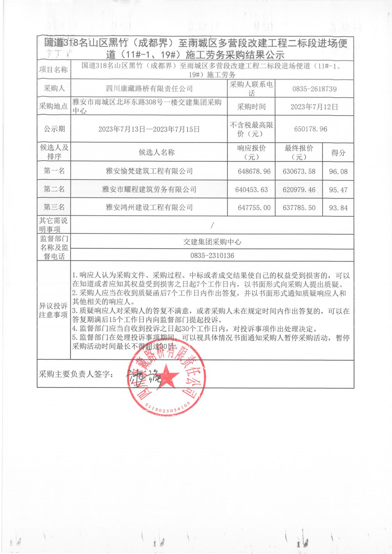 四川康藏路橋有限責(zé)任公司國道318名山區(qū)黑竹(成都界)至雨城區(qū)多營段改建工程二標(biāo)段進(jìn)場便道(11#-1、19#)施工勞務(wù)采購結(jié)果公示