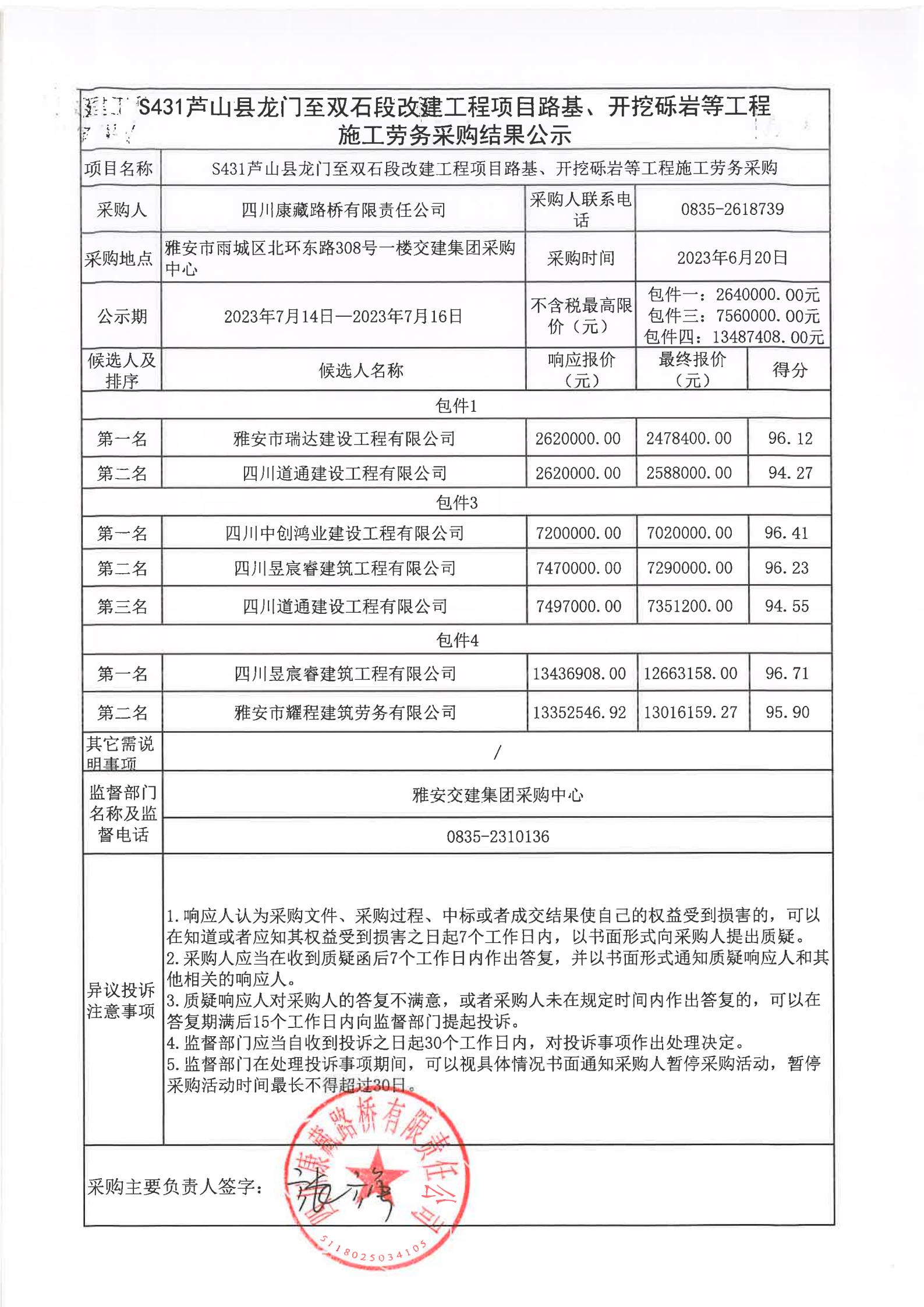 四川康藏路橋有限責(zé)任公司S431蘆山縣龍門至雙石段改建工程項(xiàng)目路基、開挖礫巖等工程施工勞務(wù)采購(gòu)結(jié)果公示