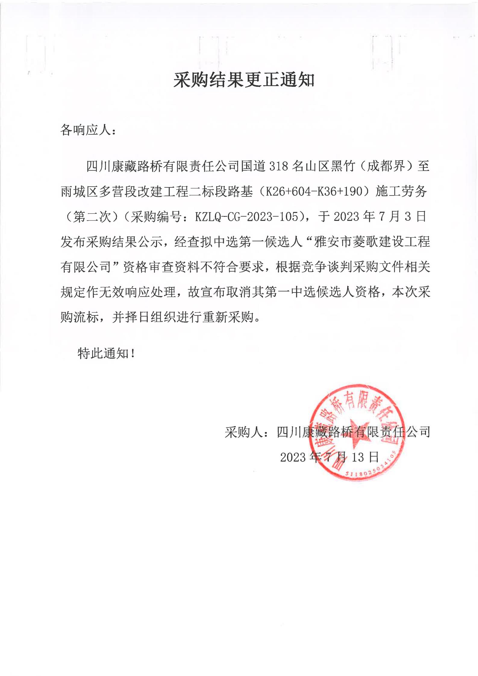 四川康藏路橋有限責(zé)任公司國道318名山區(qū)黑竹(成都界)至雨城區(qū)多營段改建工程二標段路基(K26+604-K36+190)施工勞務(wù)(第二次)采購結(jié)果更正通知