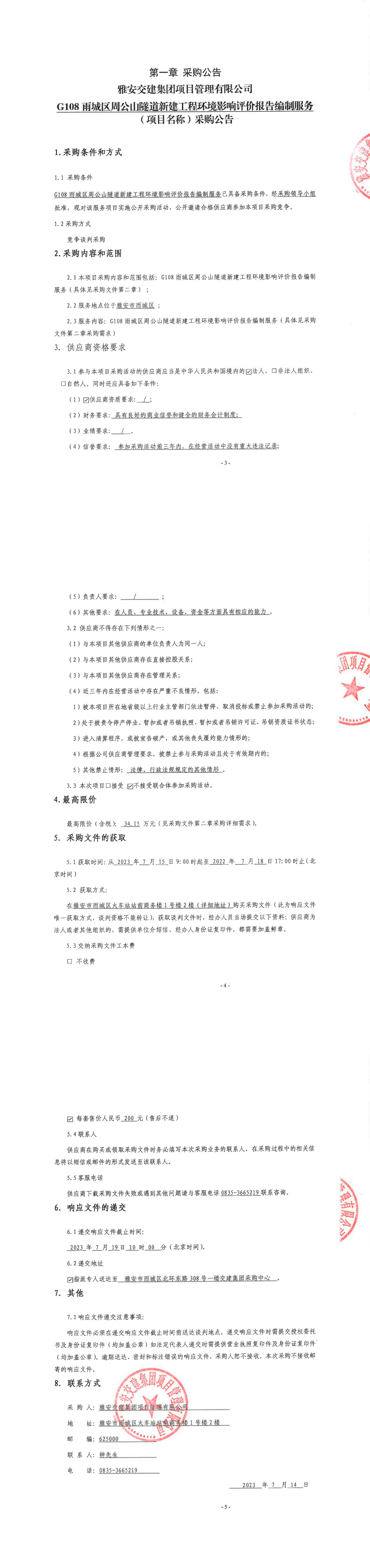 雅安交建集團(tuán)項(xiàng)目管理有限公司G108雨城區(qū)周公山隧道新建工程環(huán)境影響評(píng)價(jià)報(bào)告編制服務(wù)(項(xiàng)目名稱)采購(gòu)公告