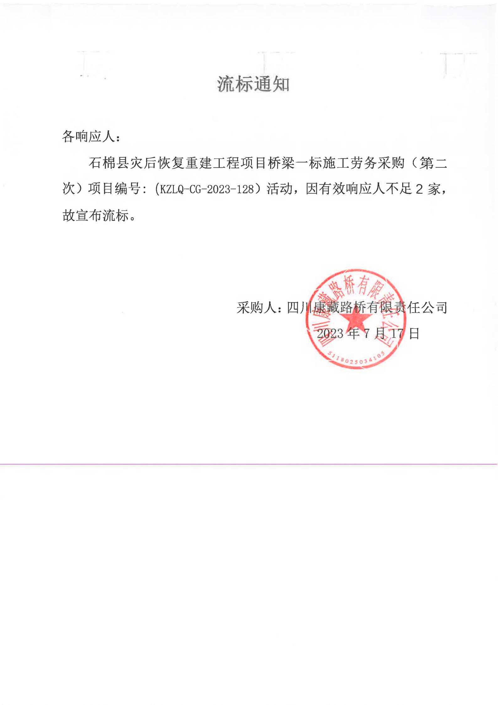 四川康藏路橋有限責(zé)任公司石棉縣災(zāi)后恢復(fù)重建工程項目橋梁一標(biāo)段施工勞務(wù)采購(第二次)流標(biāo)通知