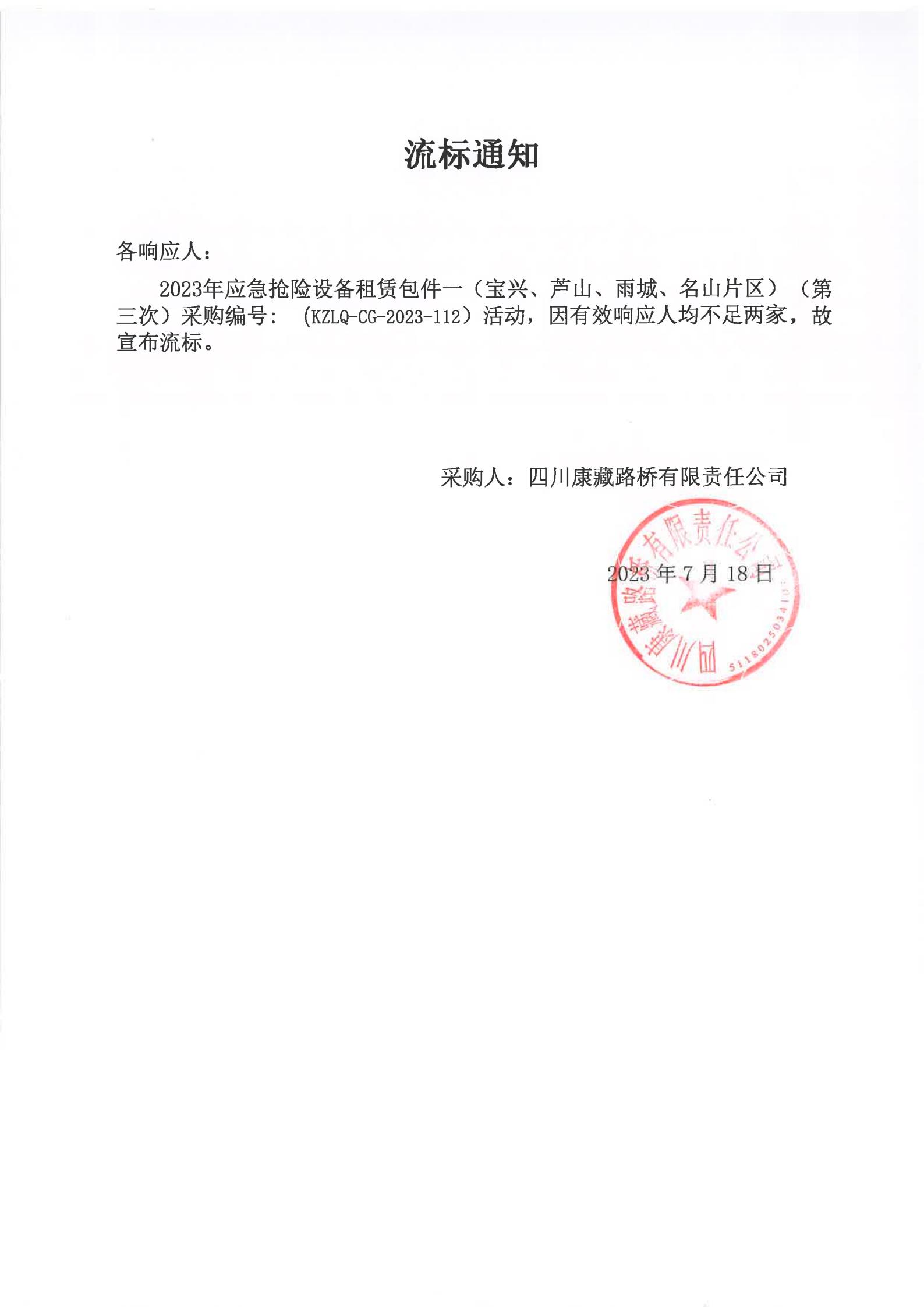 四川康藏路橋有限責(zé)任公司2023年應(yīng)急搶險(xiǎn)設(shè)備租賃包件一(寶興、蘆山、雨城、名山片區(qū))(第三次)流標(biāo)通知