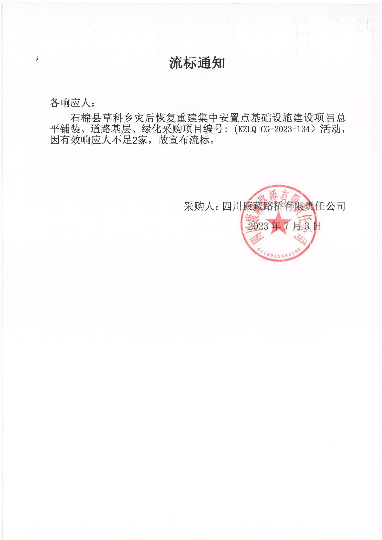 四川康藏路橋有限責(zé)任公司石棉縣草科鄉(xiāng)災(zāi)后恢復(fù)重建集中安置點(diǎn)基礎(chǔ)設(shè)施建設(shè)項(xiàng)目總平鋪裝、道路基層、綠化采購流標(biāo)通知