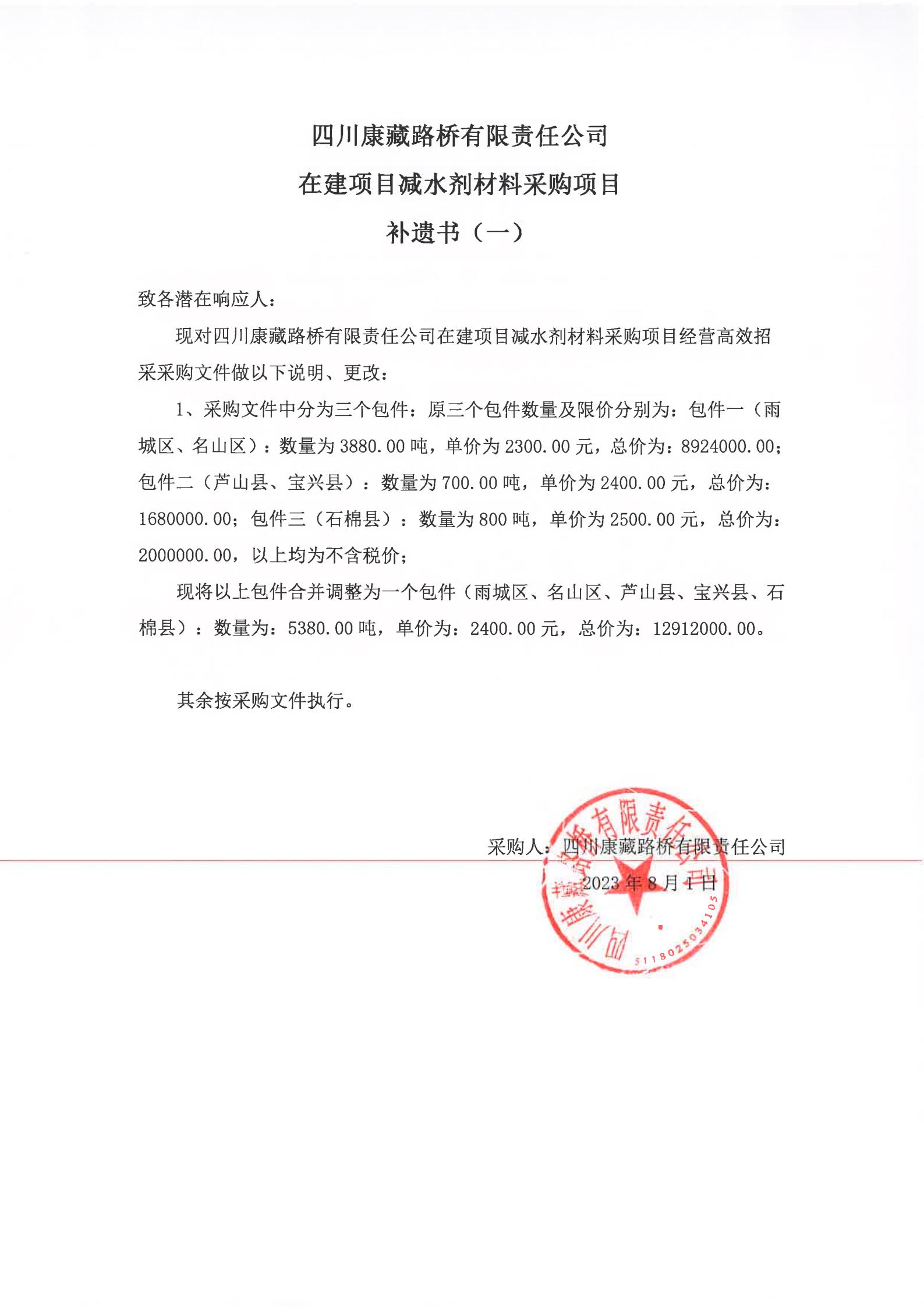 四川康藏路橋有限責(zé)任公司在建項(xiàng)目減水劑材料采購(gòu)項(xiàng)目補(bǔ)遺書(一)