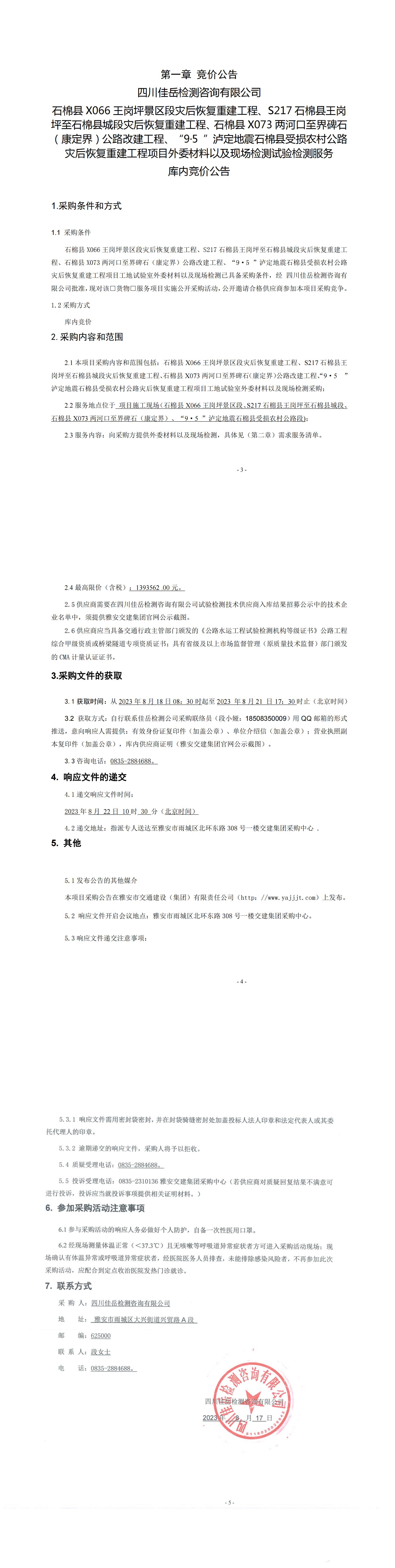 四川佳岳檢測咨詢有限公司石棉縣X066王崗坪至王崗坪景區(qū)段災后恢復重建工程、S217石棉縣王崗坪至石棉縣城段災后恢復重建工程、石棉縣X073兩河口至界碑石(康定界)公路改建工程、“9·5”瀘定地震石棉縣受損農(nóng)村公路災后恢復重建工程項目外委材料以及現(xiàn)場檢測試驗檢測服務庫內(nèi)競價公告