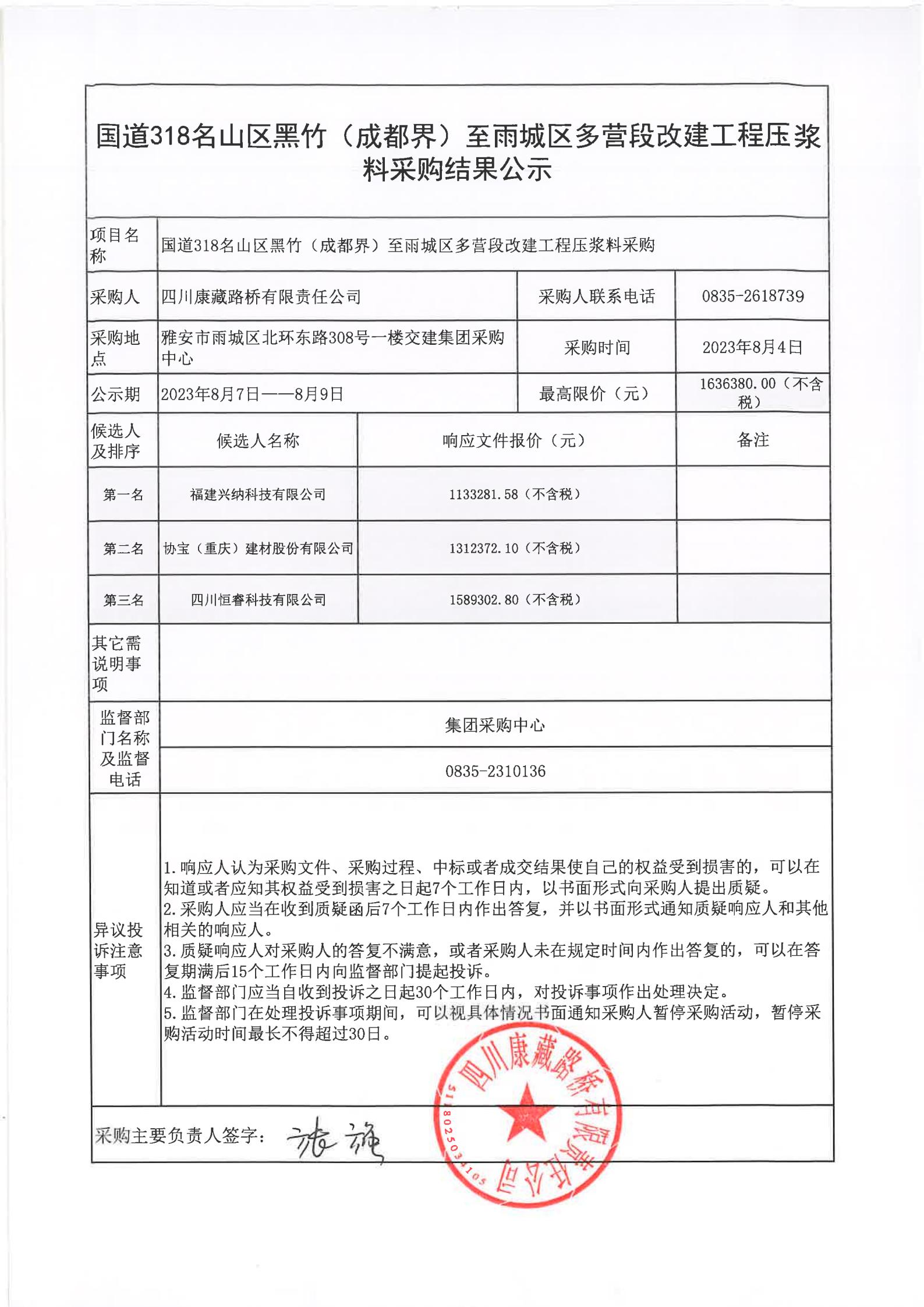 四川康藏路橋有限責(zé)任公司國道318名山區(qū)黑竹(成都界)至雨城區(qū)多營段改建工程壓漿料采購結(jié)果公示