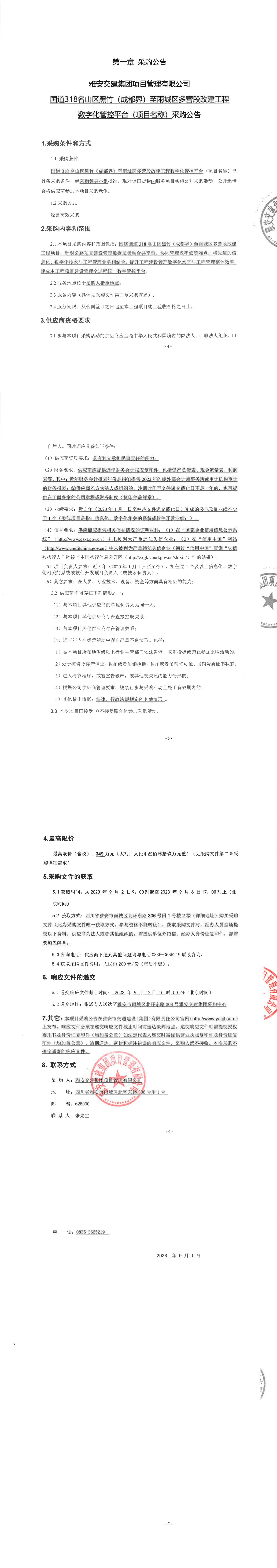 雅安交建集團(tuán)項(xiàng)目管理有限公司國(guó)道318名山區(qū)黑竹(成都界)至雨城區(qū)多營(yíng)段改建工程數(shù)字化管控平臺(tái)(項(xiàng)目名稱(chēng))采購(gòu)公告