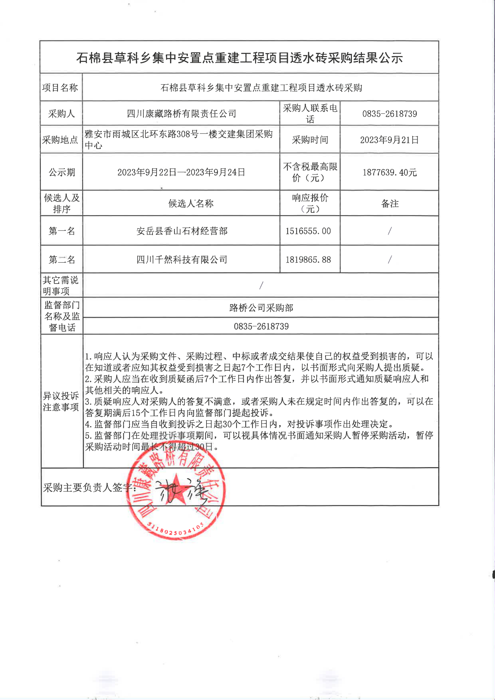 四川康藏路橋有限責任公司石棉縣草科鄉(xiāng)集中安置點重建工程項目透水磚采購結果公示