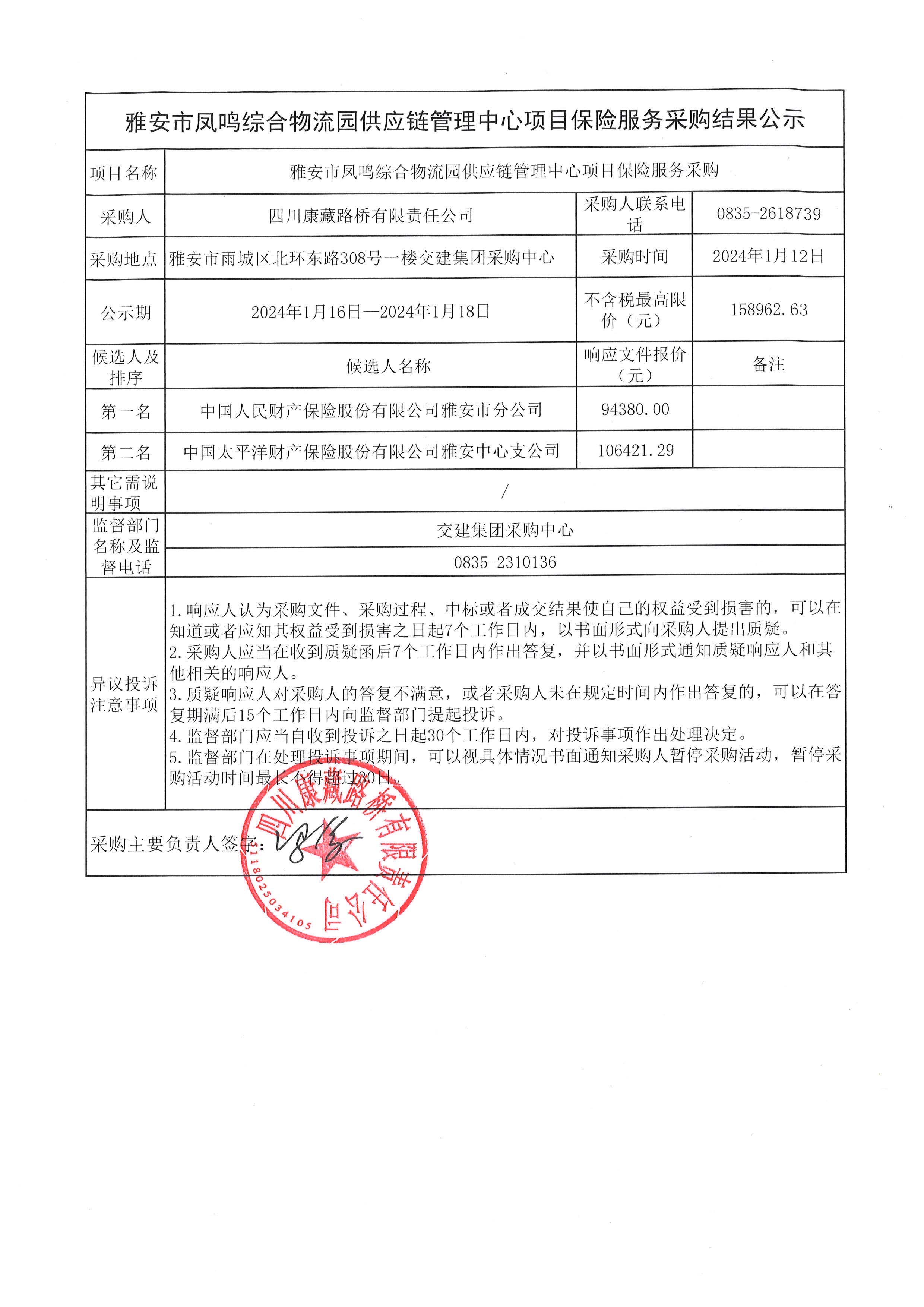 四川康藏路橋有限責(zé)任公司雅安市鳳鳴綜合物流園供應(yīng)鏈管理中心項(xiàng)目保險服務(wù)采購結(jié)果公示