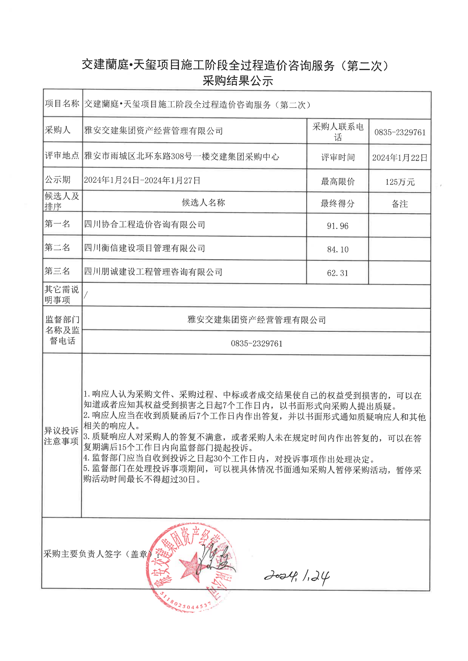 雅安交建集團(tuán)資產(chǎn)經(jīng)營(yíng)管理有限公司交建蘭庭·天璽項(xiàng)目施工階段全過(guò)程造價(jià)咨詢服務(wù)(第二次)采購(gòu)結(jié)果公示