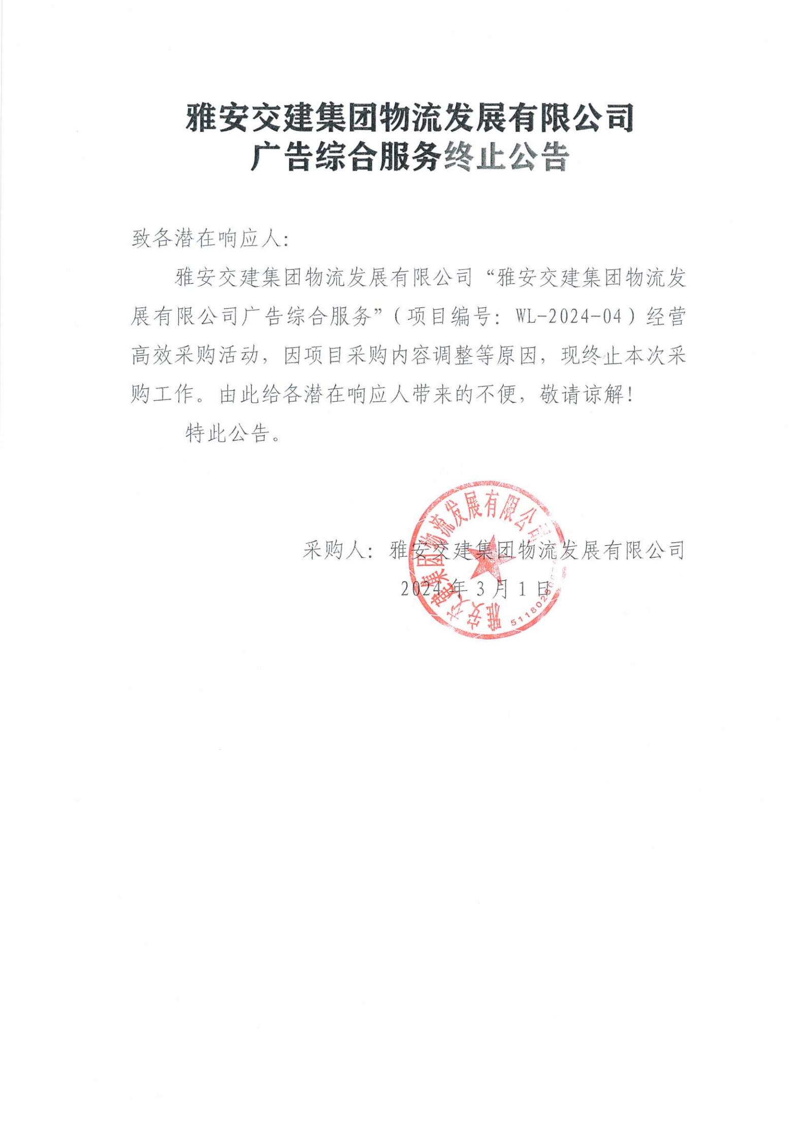 雅安交建集團(tuán)物流發(fā)展有限公司廣告綜合服務(wù)終止公告
