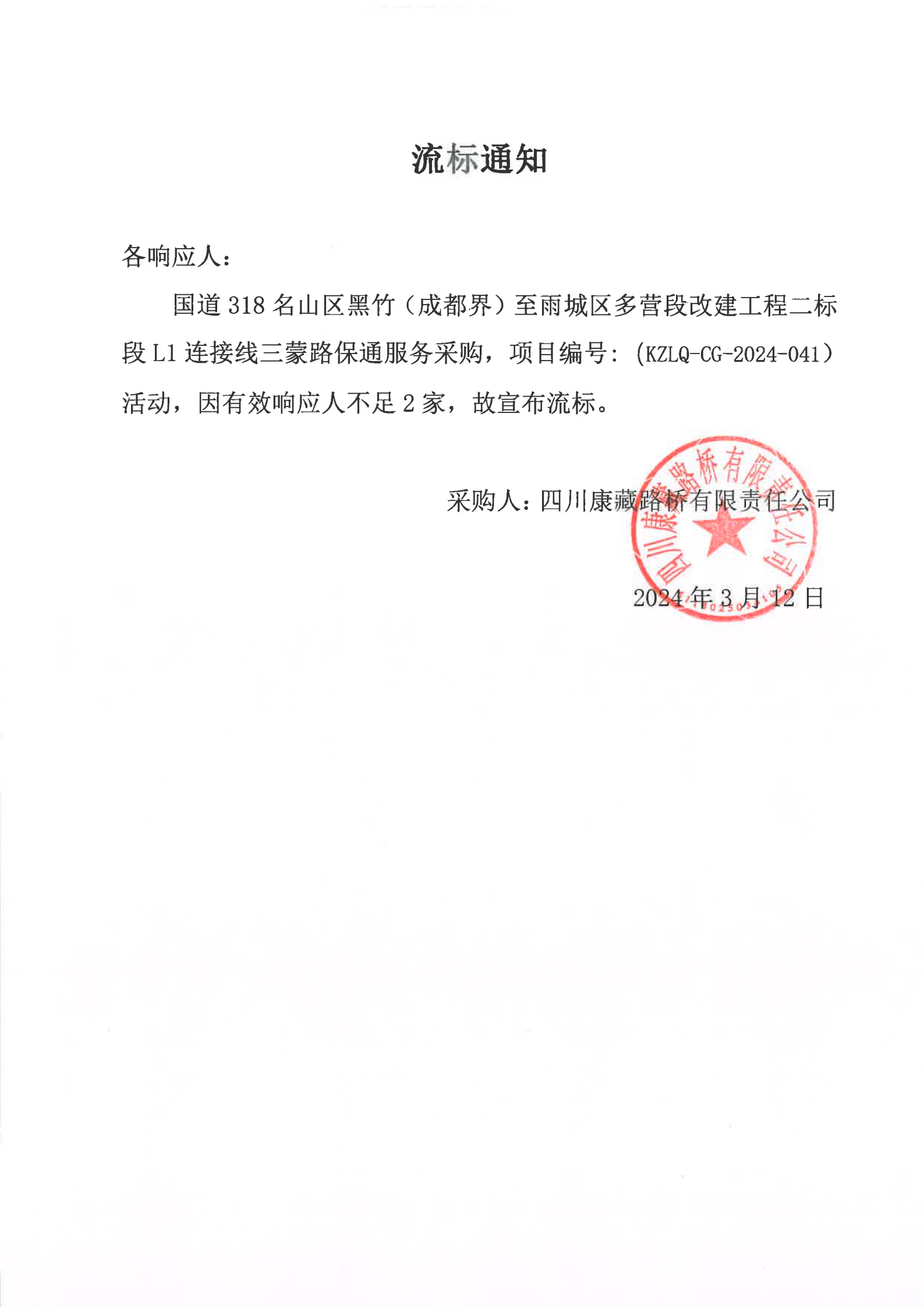 四川康藏路橋有限責任公司國道318名山區(qū)黑竹(成都界)至雨城區(qū)多營段改建工程二標段L1連接線三蒙路保通服務(wù)采購流標通知