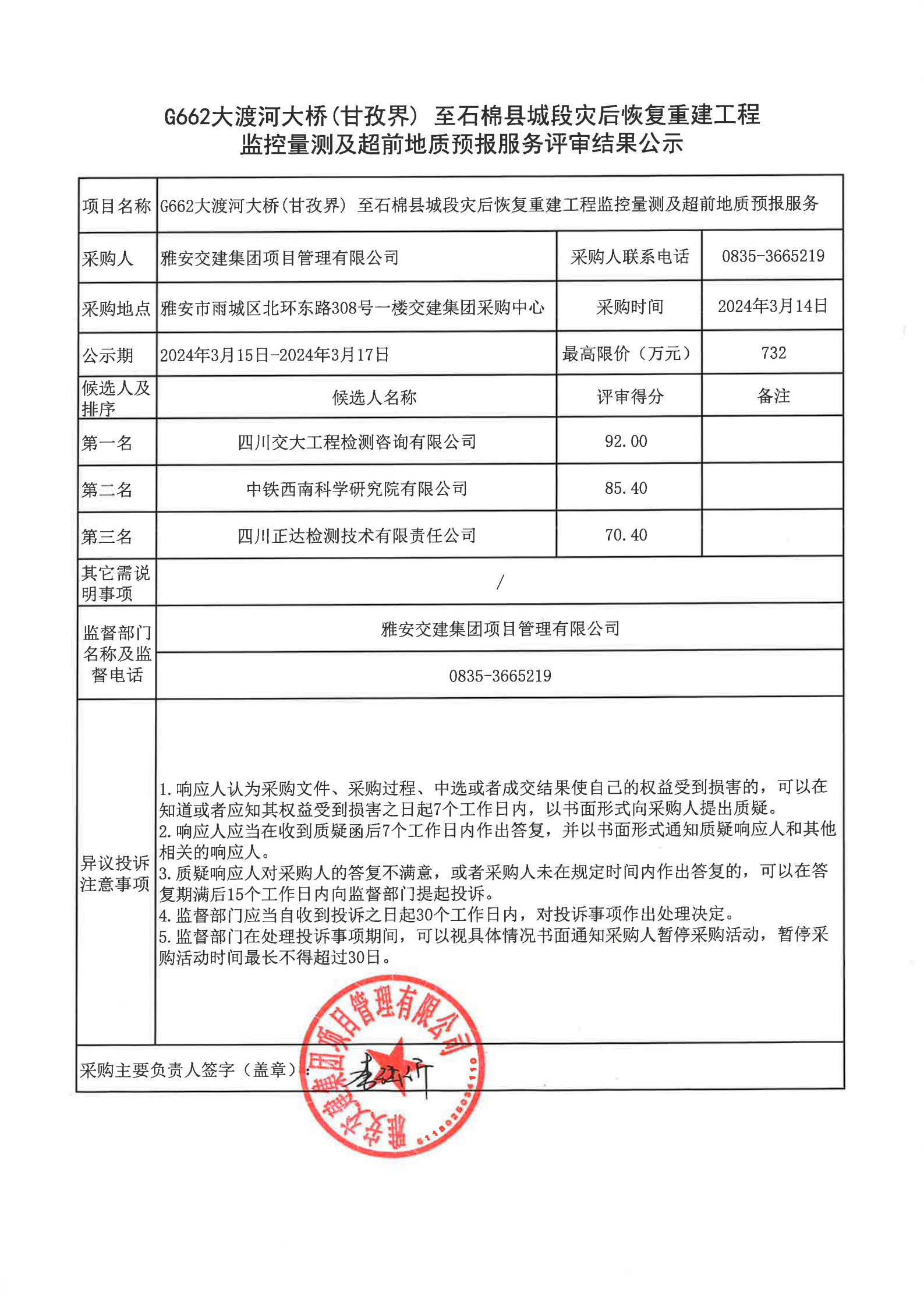 雅安交建集團項目管理有限公司G662大渡河大橋(甘孜界)至石棉縣城段災后恢復重建工程監(jiān)控量測及超前地質預報服務評審結果公示