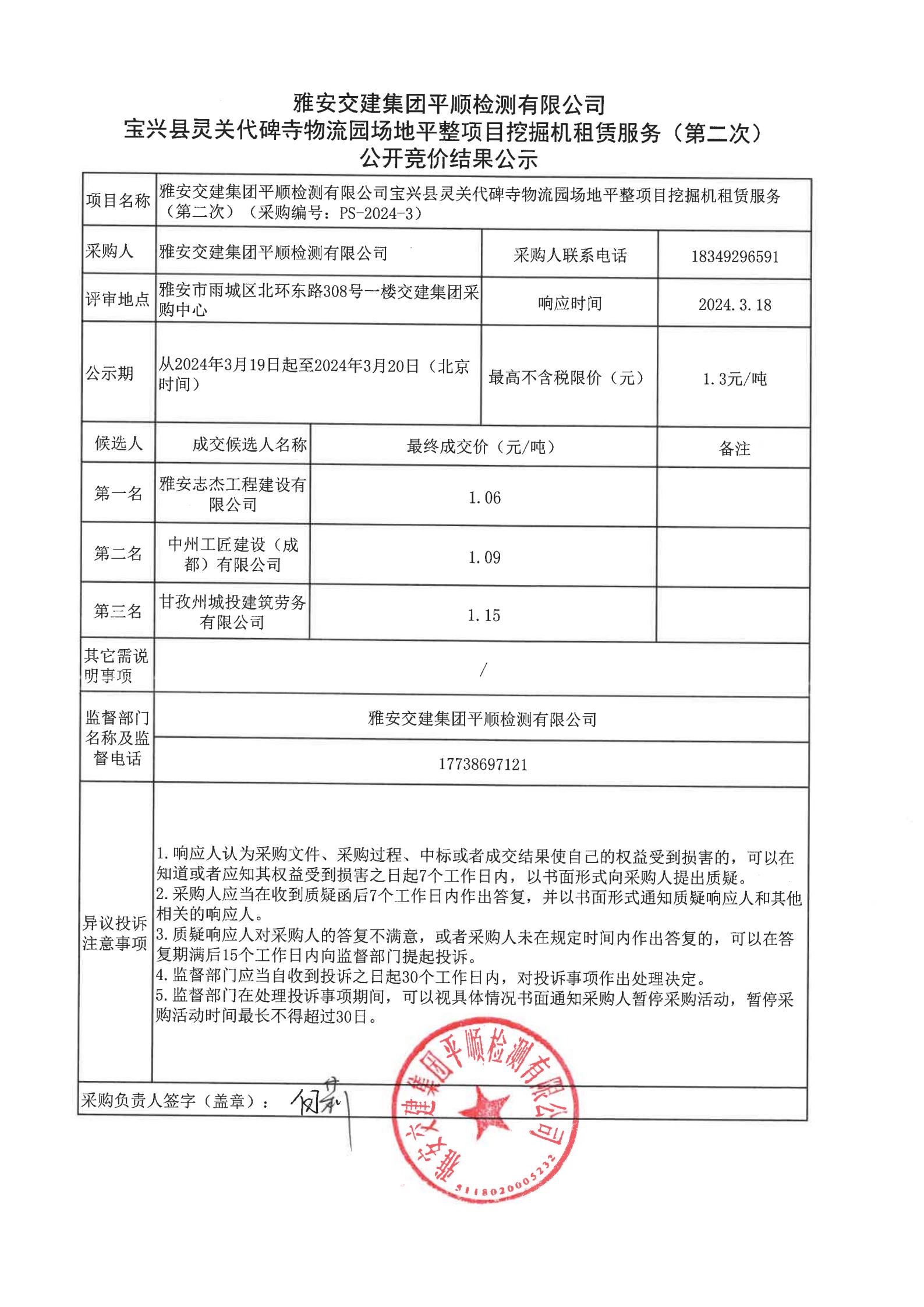 雅安交建集團(tuán)平順檢測(cè)有限公司寶興縣靈關(guān)代碑寺物流園場地平整項(xiàng)目挖掘機(jī)租賃服務(wù)(第二次)競價(jià)結(jié)果公示