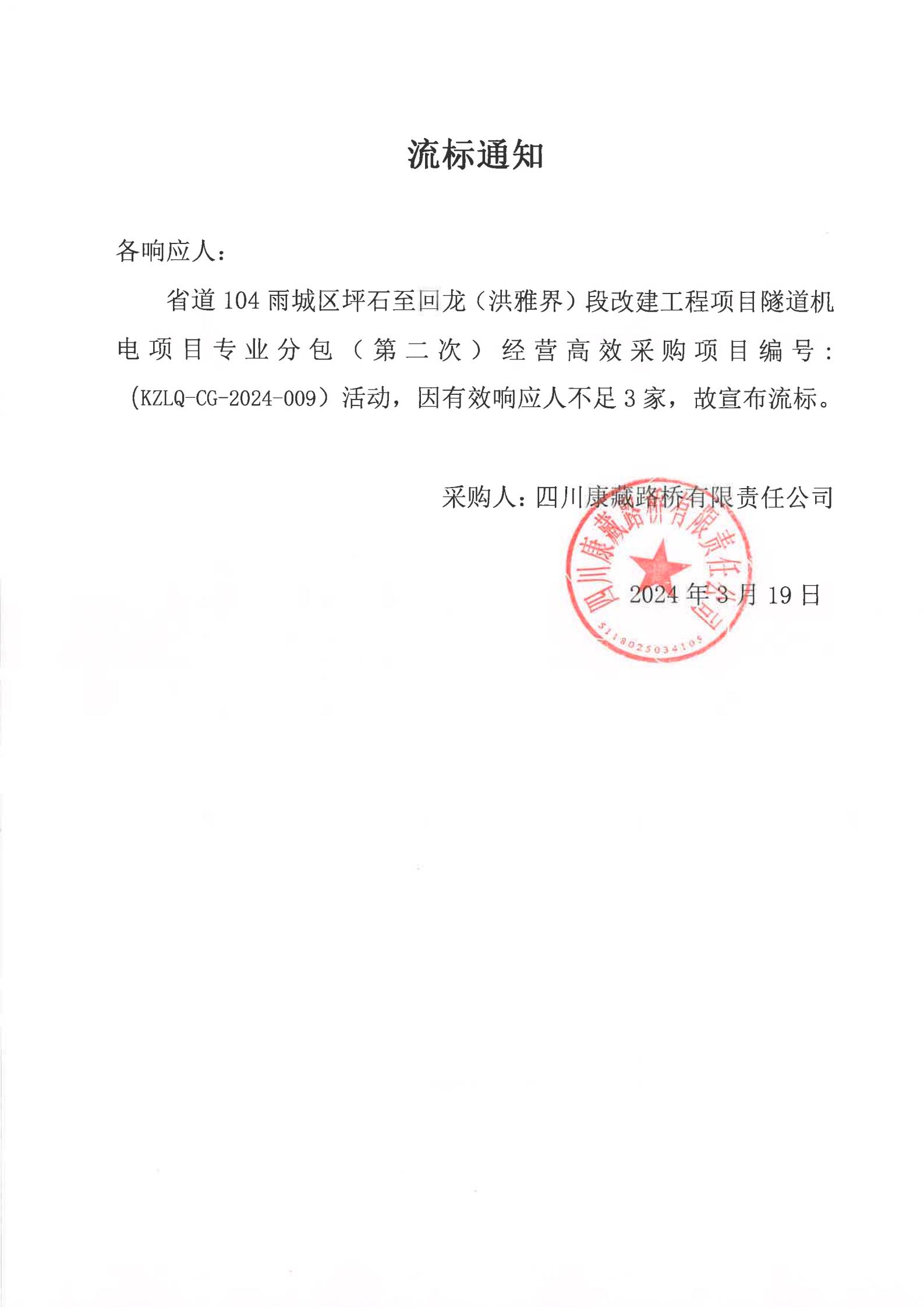 四川康藏路橋有限責(zé)任公司省道104雨城區(qū)坪石至回龍(洪雅界)段改建工程項(xiàng)目隧道機(jī)電項(xiàng)目專業(yè)分包經(jīng)營高效采購(第二次)流標(biāo)通知
