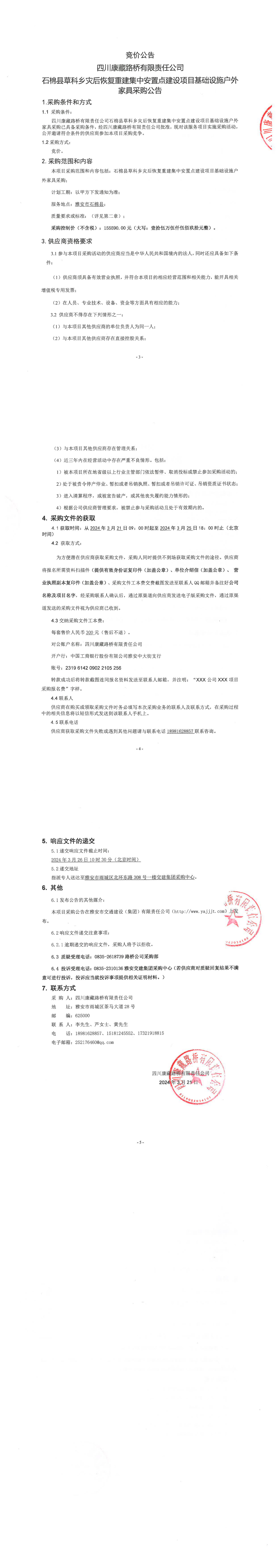 四川康藏路橋有限責(zé)任公司石棉縣草科鄉(xiāng)災(zāi)后恢復(fù)重建集中安置點建設(shè)項目基礎(chǔ)設(shè)施戶外家具采購公告