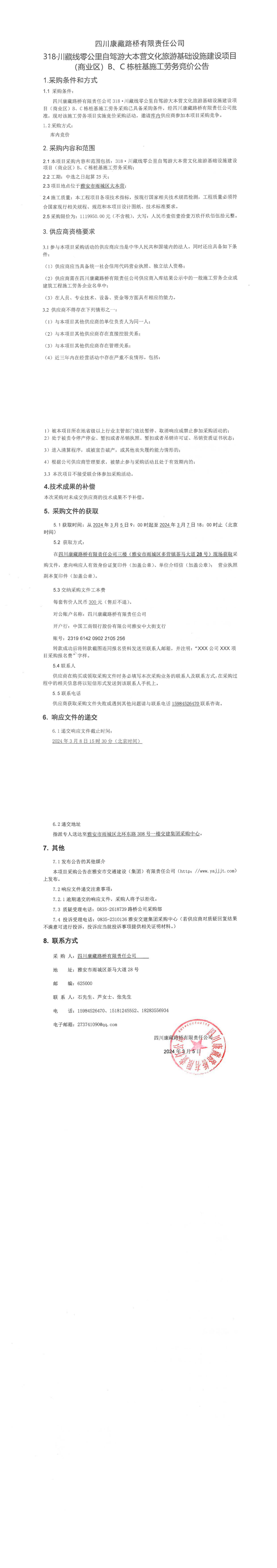 四川康藏路橋有限責(zé)任公司318·川藏公路零公里自駕游大本營文化旅游基礎(chǔ)設(shè)施建設(shè)項(xiàng)目(商業(yè)區(qū))B\C棟樁基施工勞務(wù)競價公告