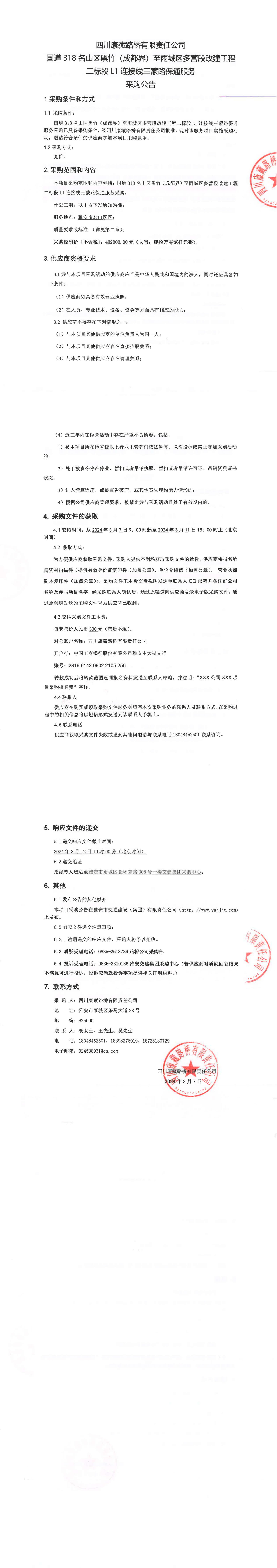 四川康藏路橋有限責(zé)任公司國(guó)道318名山區(qū)黑竹(成都界)至雨城區(qū)多營(yíng)段改建工程二標(biāo)段L1連接線三蒙路保通服務(wù)采購公告