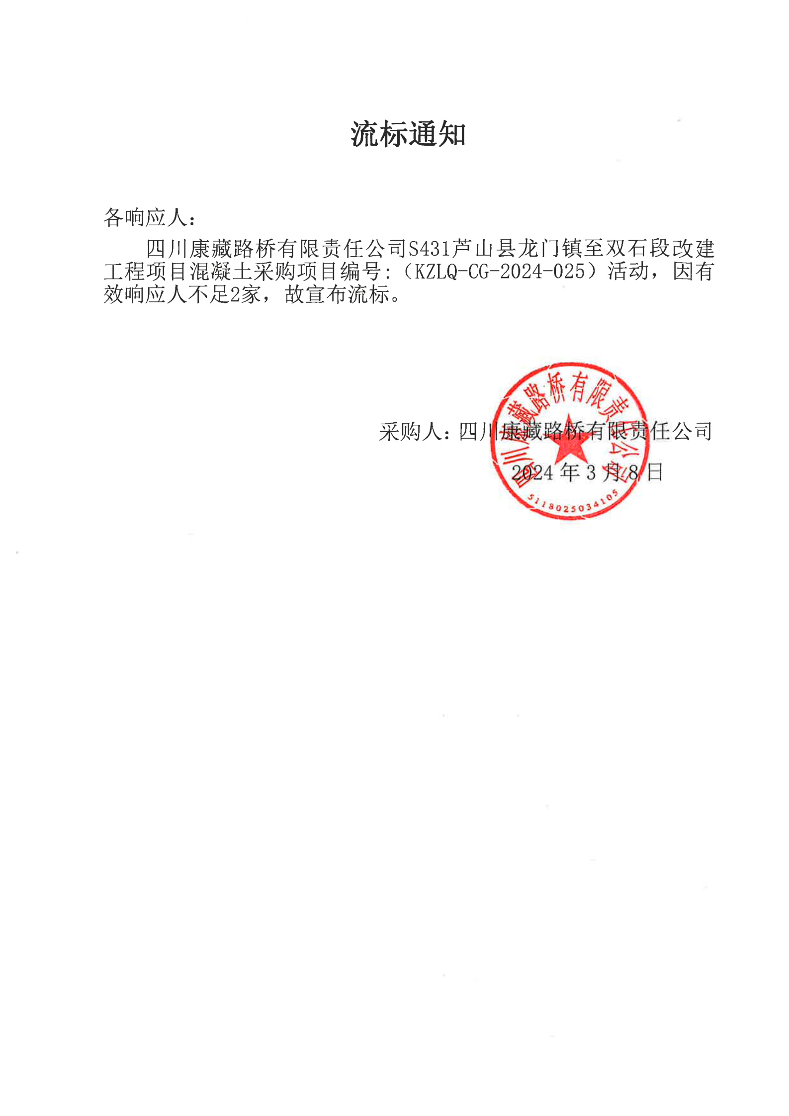 四川康藏路橋有限責任公司S431蘆山縣龍門鎮(zhèn)至雙石段改建工程項目混凝土采購流標通知