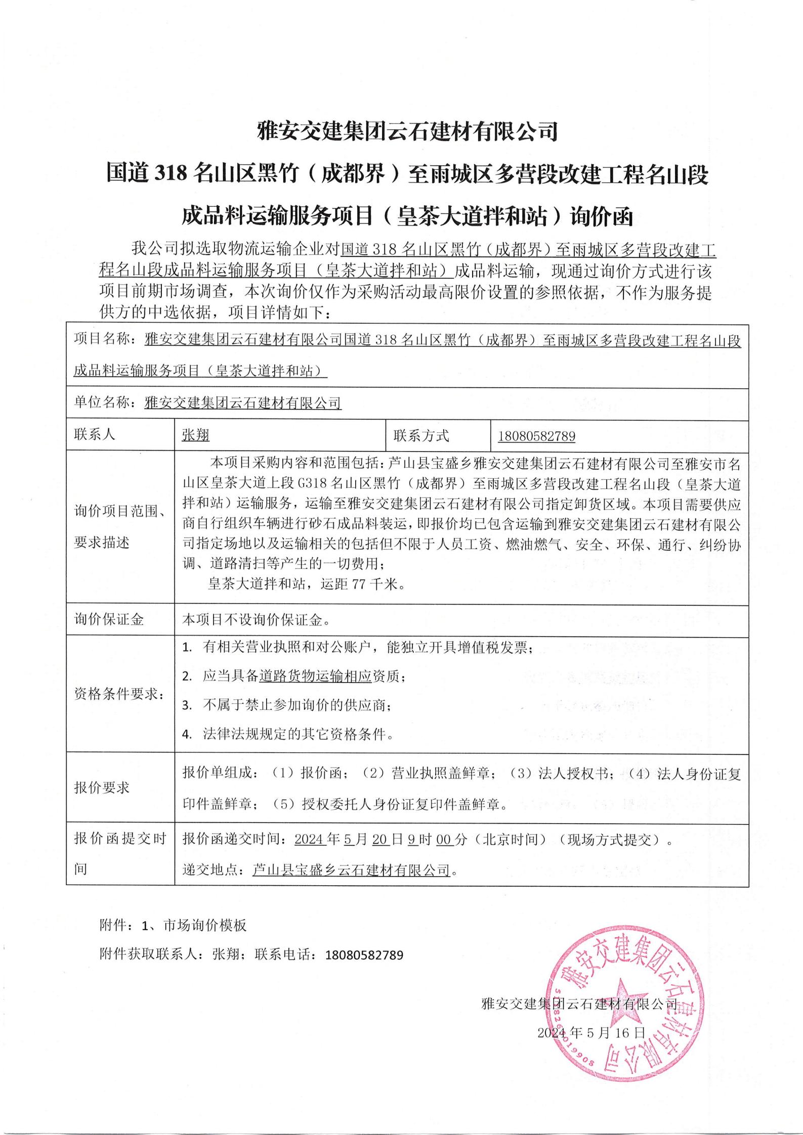 雅安交建集團(tuán)云石建材有限公司國道318名山區(qū)黑竹(成都界)至雨城區(qū)多營段改建工程名山段成品料運輸服務(wù)項目(皇茶大道拌和站)詢價函