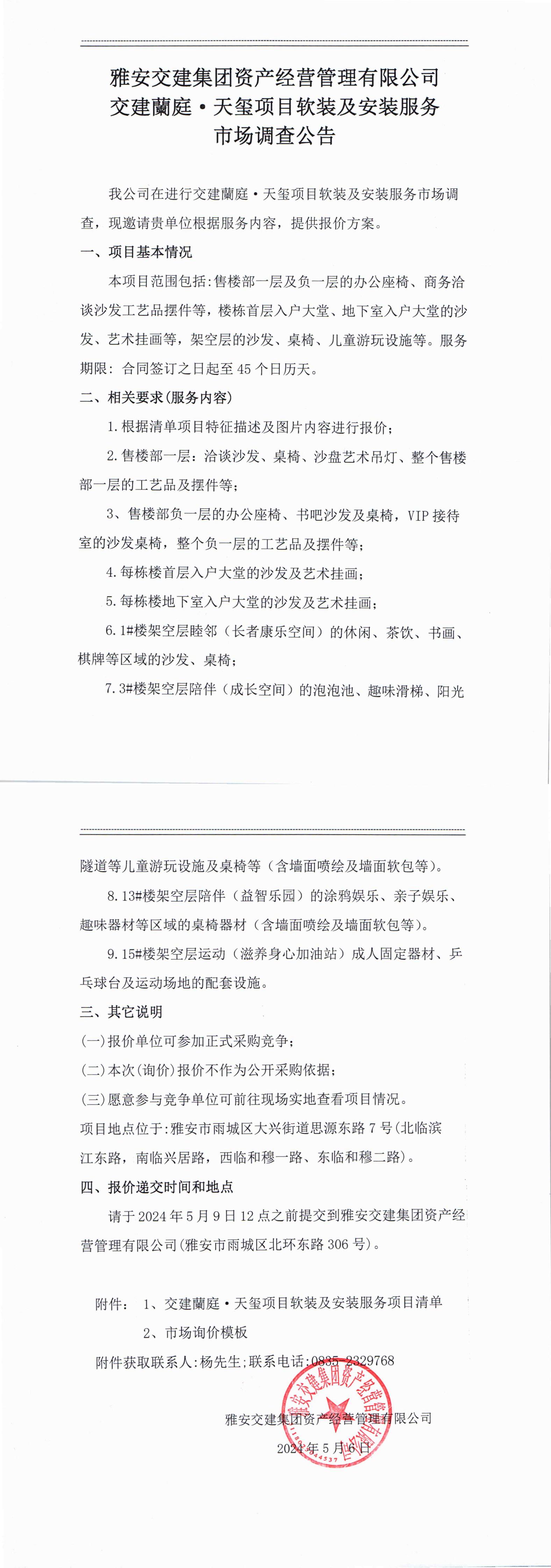雅安交建集團資產(chǎn)經(jīng)營管理有限公司交建蘭庭·天璽項目軟裝及安裝服務(wù)市場調(diào)查公告