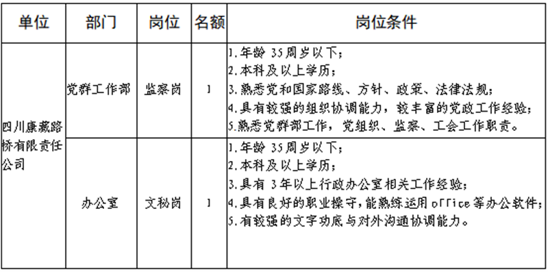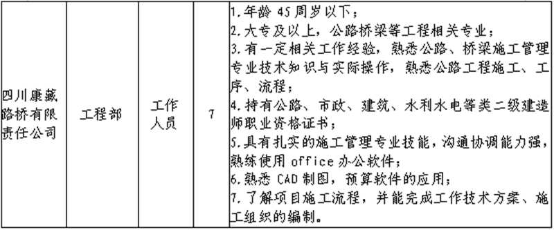 根據(jù)發(fā)展需要,決定面向社會公開招聘雅安市交通建設(shè)(集團(tuán))有限責(zé)任公司(以下簡稱“雅安交建集團(tuán)”)所屬子公司工作人員16名,現(xiàn)將有關(guān)事項(xiàng)公告如下: