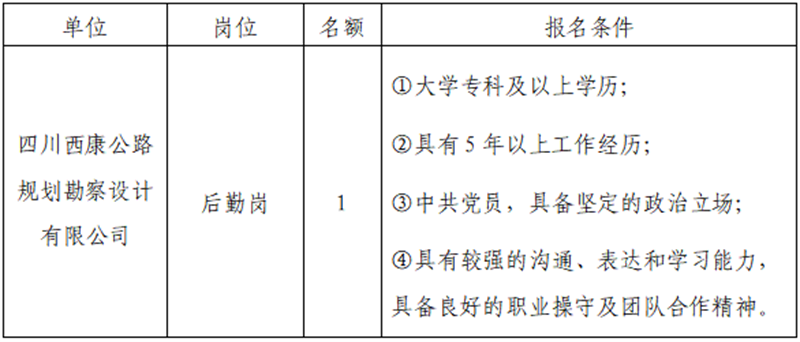 根據(jù)發(fā)展需要,決定面向社會(huì)公開(kāi)招聘雅安市交通建設(shè)(集團(tuán))有限責(zé)任公司(以下簡(jiǎn)稱“雅安交建集團(tuán)”)所屬子公司綜合辦公室后勤崗1名,現(xiàn)將有關(guān)事項(xiàng)公告如下: