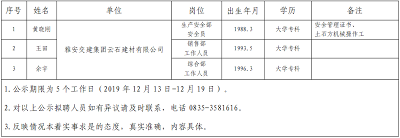 雅安交建集團子公司擬聘用人員公示(云石公司)