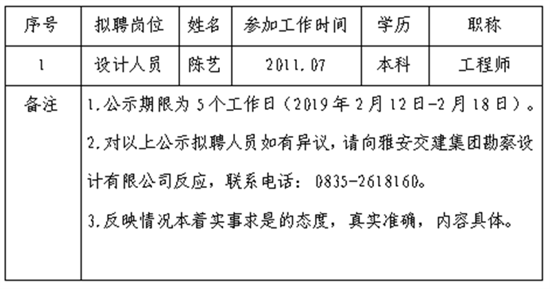 通過公開報名、資格審查、面試等程序,經(jīng)雅安交建集團(tuán)勘察設(shè)計(jì)有限公司研究,對以下1名擬聘用人員予以公示: